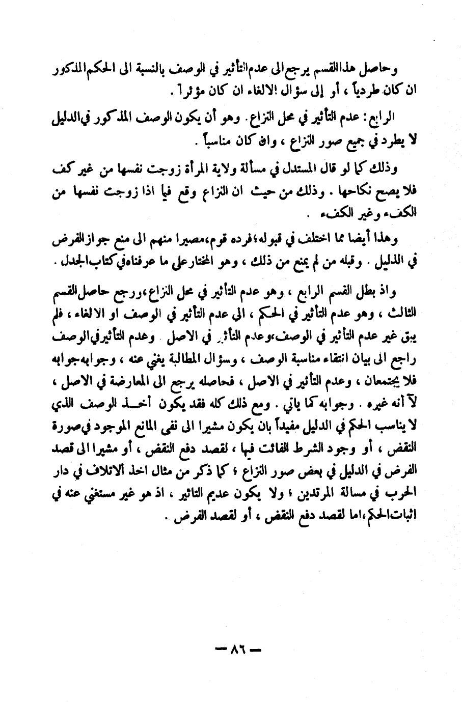 وَإِذَا بَطَلَ الْقِسْمُ الرَّابِعُ، وَهُوَ عَدَمُ التَّأْثِيرِ فِي مَحَلِّ النِّزَاعِ وَرَجَعَ حَاصِلُ الْقِسْمِ الثَّالِثِ، وَهُوَ عَدَمُ التَّأْثِيرِ فِي الْحُكْمِ إِلَى عَدَمِ التَّأْثِيرِ فِي الْوَصْفِ أَوِ الْإِلْغَاءِ، فَلَمْ يَبْقَ غَيْرُ عَدَمِ التَّأْثِيرِ فِي الْوَصْفِ وَعَدَمِ التَّأْثِيرِ فِي الْأَصْلِ، وَعَدَمُ التَّأْثِيرِ فِي الْوَصْفِ رَاجِعٌ إِلَى بَيَانِ انْتِفَاءِ مُنَاسَبَةِ الْوَصْفِ، وَسُؤَالُ الْمُطَالَبَةِ يُغْنِي عَنْهُ، وَجَوَابُهُ جَوَابُهُ فَلَا يَجْتَمِعَانِ، وَعَدَمُ التَّأْثِيرِ فِي الْأَصْلِ، فَحَاصِلُهُ يَرْجِعُ إِلَى الْمُعَارَضَةِ فِي الْأَصْلِ لَا أَنَّهُ غَيْرُهُ، وَجَوَابُهُ كَمَا يَأْتِي.