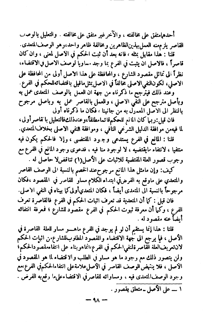 قُلْنَا: هَذَا إِنَّمَا يَسْتَقِيمُ أَنْ لَوْ لَمْ يُوجَدْ فِي الْفَرْعِ مَا هُوَ مُسَاوٍ لِلْعِلَّةِ الْقَاصِرَةِ فِي الْأَصْلِ فِيمَا يَرْجِعُ إِلَى جِهَةِ الِاقْتِضَاءِ، وَالْمَقْصُودُ الْمَطْلُوبُ لِلشَّارِعِ مِنْ إِثْبَاتِ الْحُكْمِ؛ لِأَنَّ تَعْرِيفَ الْعِلَّةِ الْقَاصِرَةِ لِنَفْيِ الْحُكْمِ فِي الْفَرْعِ إِنَّمَا هُوَ بِنَاءً عَلَى انْتِفَاءِ مَقْصُودِ الْحُكْمِ، وَلَنْ يُتَصَوَّرَ ذَلِكَ مَعَ وُجُودِ مَا هُوَ مُسَاوٍ فِي الطَّلَبِ وَالِاقْتِضَاءِ لِمَا هُوَ الْمَقْصُودُ فِي الْأَصْلِ، فَلَا يَنْتَهِضُ الْوَصْفُ الْقَاصِرُ فِي الْأَصْلِ عَلَامَةٌ عَلَى انْتِفَاءِ الْحُكْمِ فِي الْفَرْعِ مَعَ وُجُودِ الْوَصْفِ الْمُتَعَدِّي فِيهِ وَمُسَاوَاتِهِ لِلْقَاصِرِ فِي الِاقْتِضَاءِ عَلَى مَا وَقَعَ بِهِ الْفَرْضُ.
