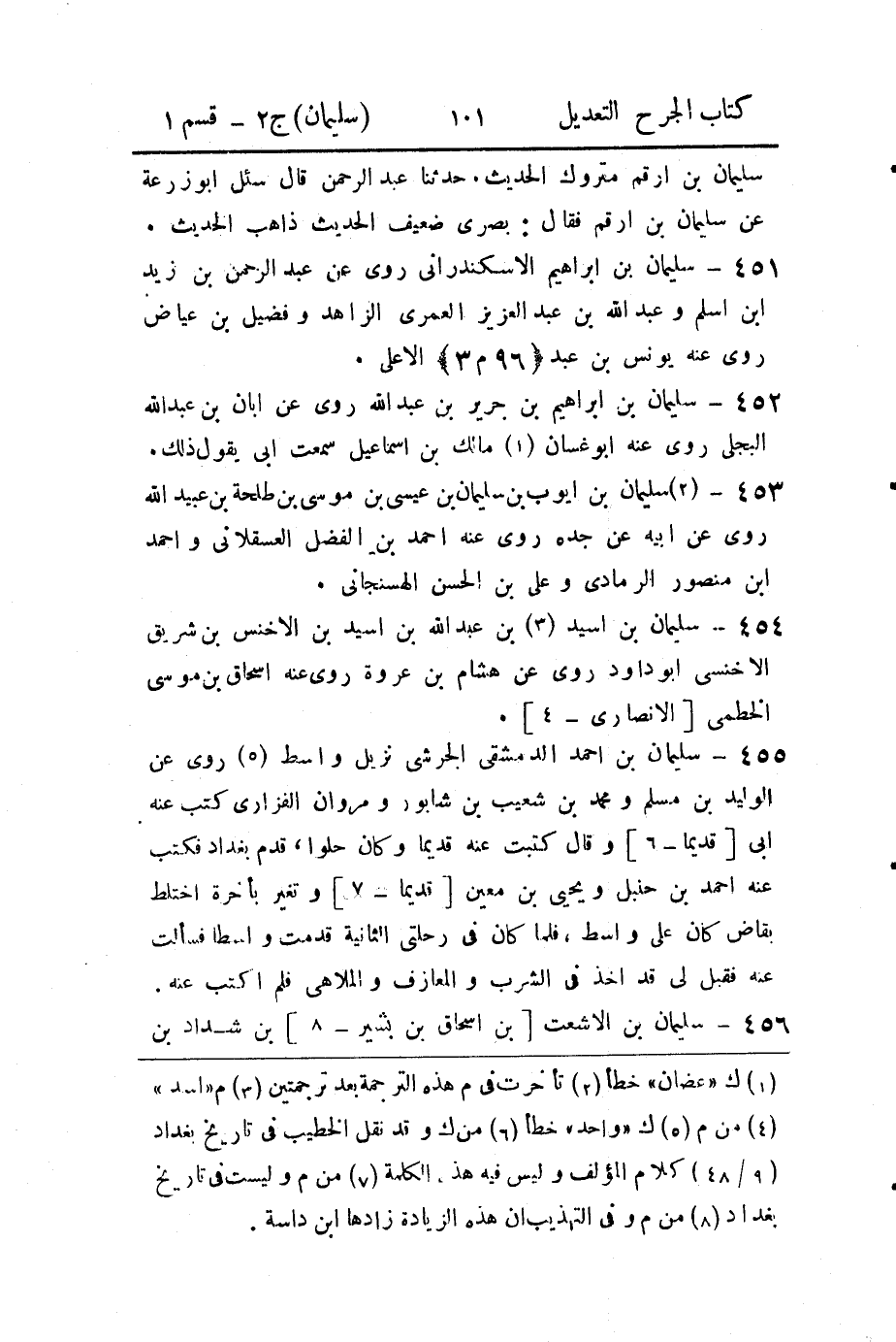 (1) ك " عضان " خطأ (2) تأخرت في م هذه الترجمة بعد ترجمتين (3) م " اسد " (4) من م (5) ك " واحد " خطأ (6) من ك وقد نقل الخطيب في تاريخ بغداد (9 / 48) كلام المؤلف وليس فيه هذه الكلمة (7) من م وليست في تاريخ بغداد (8) من م وفى التهذيب ان هذه الزيادة زادها ابن داسة.
