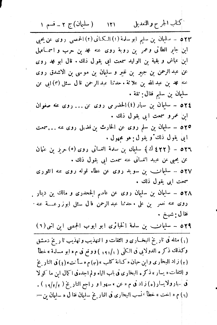 523 - سليمان بن سليم أبو سلمة (1) الكناني (2) الحمصي روى عن يحيى ابن جابر الطائي وعمر بن روبة روى عنه محمد بن حرب واسماعيل ابن عياش وبقية بن الوليد سمعت أبي يقول ذلك.