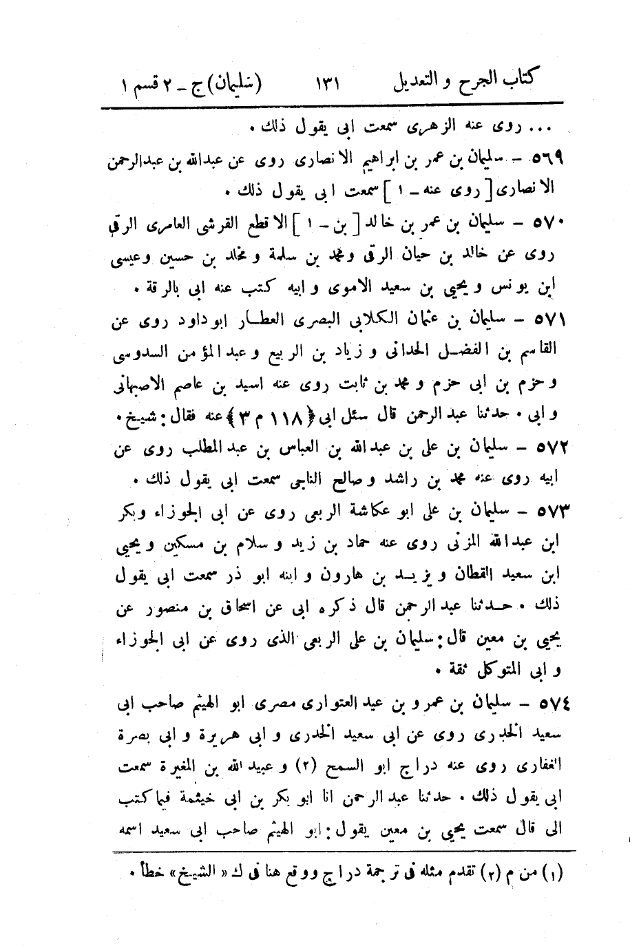 574 - سليمان بن عمرو بن عبد العتواري مصري أبو الهيثم صاحب أبي سعيد الخدري روى عن أبي سعيد الخدري وأبي هريرة وأبي بصرة الغفاري روى عنه دراج أبو السمح (2) وعبيد الله بن المغيرة سمعت أبي يقول ذلك.