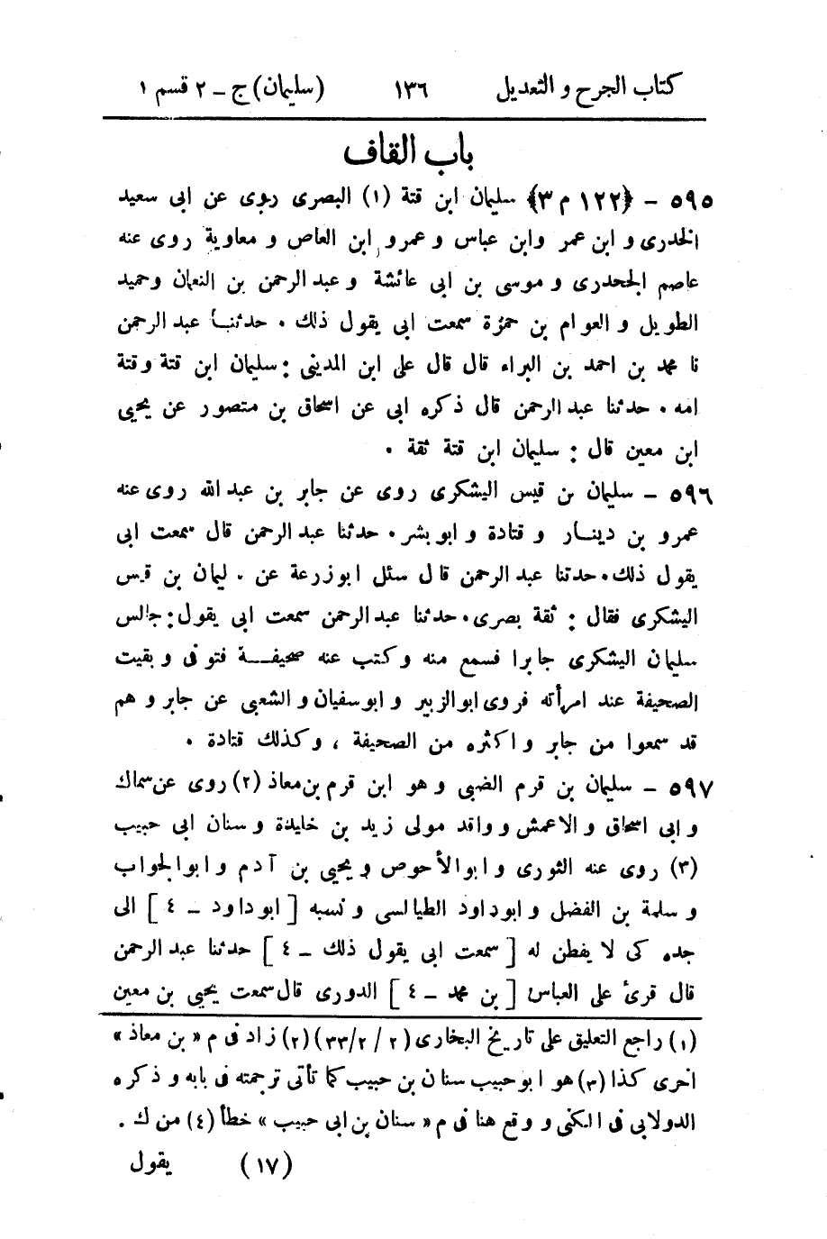 597 - سليمان بن قرم الضبي وهو ابن قرم بن معاذ (2) روى عن سماك وأبي إسحاق والأعمش وواقد مولى زيد بن خليدة وسنان أبي حبيب (3) روى عنه الثوري وأبو الأحوص ويحيى بن آدم وأبو الجواب وسلمة بن الفضل وأبو داود الطيالسي ونسبه [أبو داود - 4] إلى جده كي لا يفطن له [سمعت أبي يقول ذلك - 4] حدثنا عبد الرحمن قال قرئ على العباس [بن محمد - 4] الدوري قال سمعت يحيى بن معين