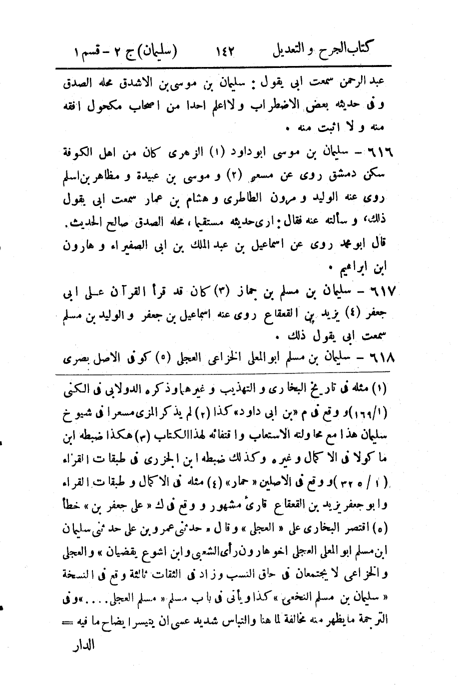 وابو جعفر يزيد بن القعقاع قارئ مشهور ووقع في ك " على جعفر بن " خطأ (5) اقتصر البخاري على " العجلى " وقال " حدثنى عمرو بن على حدثنى سليمان ابن مسلم أبو المعلى العجلى اخو هارون رأى الشعبى وابن اشوع يقضيان " والعجلي والخزاعي لا يجتمعان في حاق النسب وزاد في الثقات ثالثة وقع في النسخة " سليمان بن مسلم النخعي " كذا ويأتى في باب مسلم " مسلم العجلى ... " وفى الترجمة ما يظهر منه مخالفة لما هنا والتباس شديد عسى ان يتيسر ايضاح ما فيه = (*)
