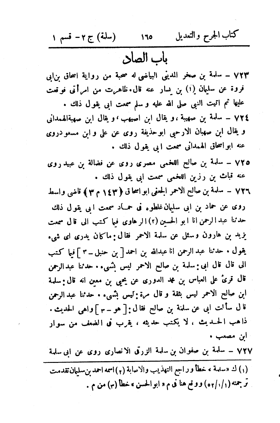 726 - سلمة بن صالح الاحمر الجعفي أبو اسحاق (143 م 3) قاضي واسط روى عن حماد بن أبي سليمان غلطوه في حماد سمعت أبي يقول ذلك حدثنا عبد الرحمن أنا أبو الحسين (2) الرهاوي فيما كتب إلي قال سمعت يزيد بن هارون وسئل عن سلمة الأحمر فقال: ما كان يدرى أي شئ يقول.
