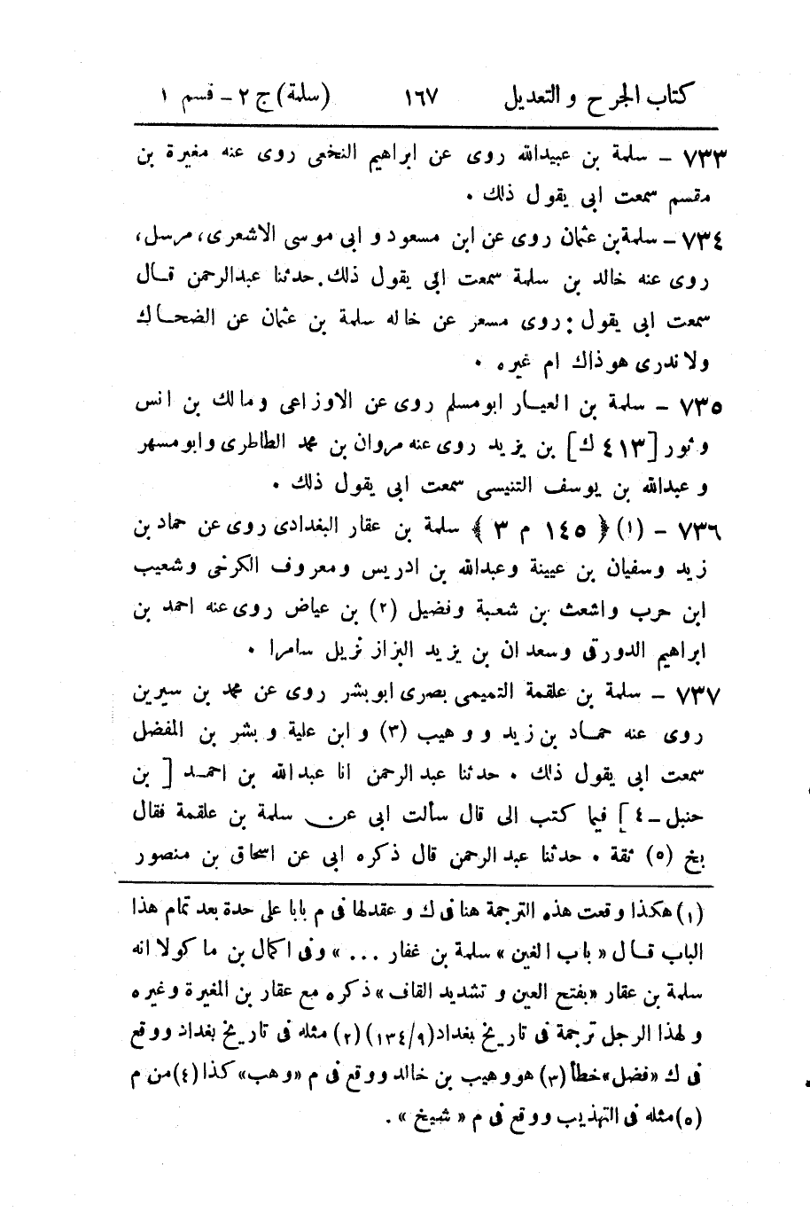 736 - (1) (145 م 3) سلمة بن عقار البغدادي روى عن حماد بن زيد وسفيان بن عيينة وعبد الله بن ادريس ومعروف الكرخي وشعيب ابن حرب وأشعث بن شعبة وفضيل (2) بن عياض روى عنه أحمد بن إبراهيم الدورقي وسعدان بن يزيد البزاز نزيل سامرا.