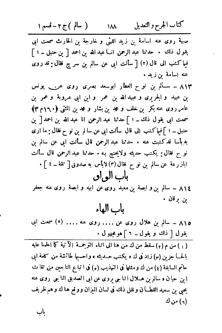(1) من م (2) سقط من ك من هنا إلى اثناء الترجمة الآتية كما اعلمنا عليه بالحاجزين (3) زاد في ك " يكتب حديثه " واحسبها طائشة من كلمة ابى حاتم السابقة (4) من ك ومثلها في التهذيب (5) في اتباع التابعين من ثقات ابن حبان " سالم بن هلال الناجى يروى عن أبي الصديق الناجي روى عنه يحيى بن سعيد القطان ونقل ذلك في لسان الميزان ووقع هناك وهم ظريف (6) من ك.
