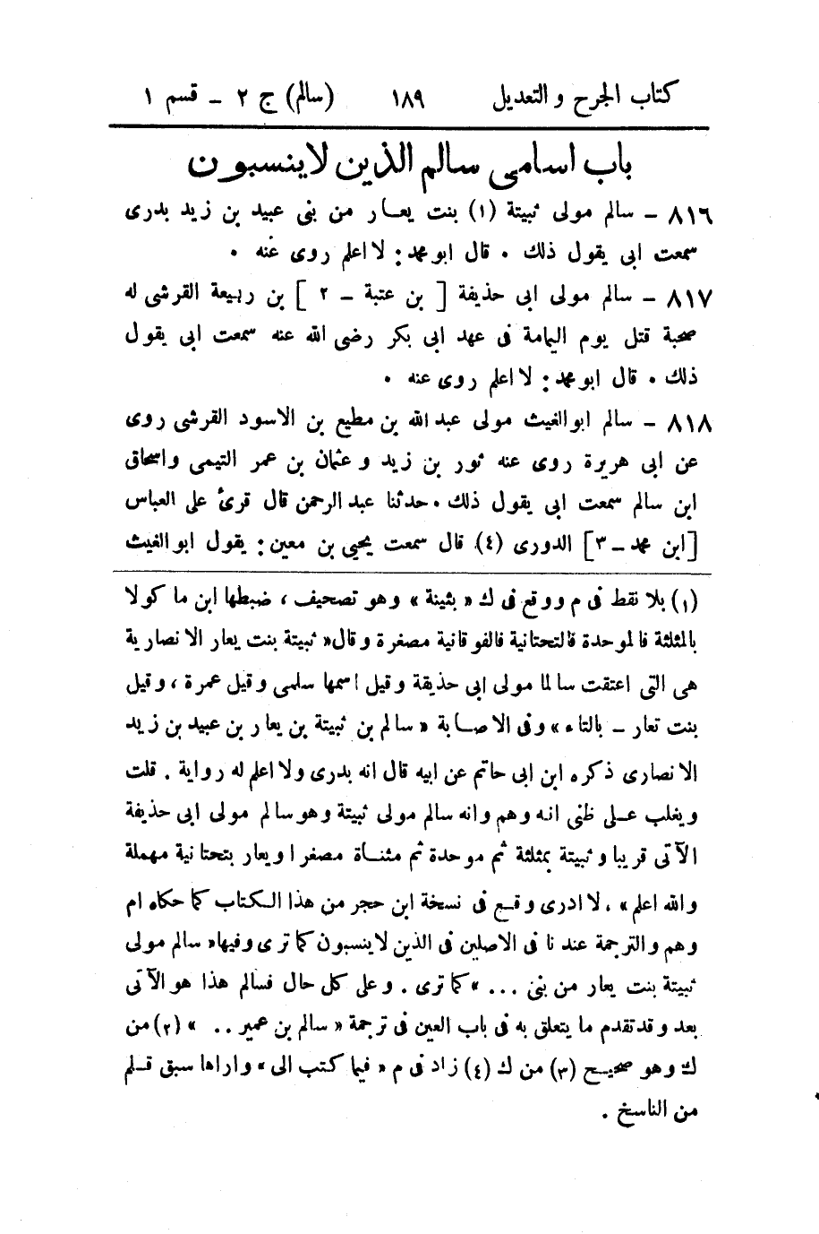 816 - سالم مولى ثبيتة (1) بنت يعار من بني عبيد بن زيد بدري سمعت أبي يقول ذلك.