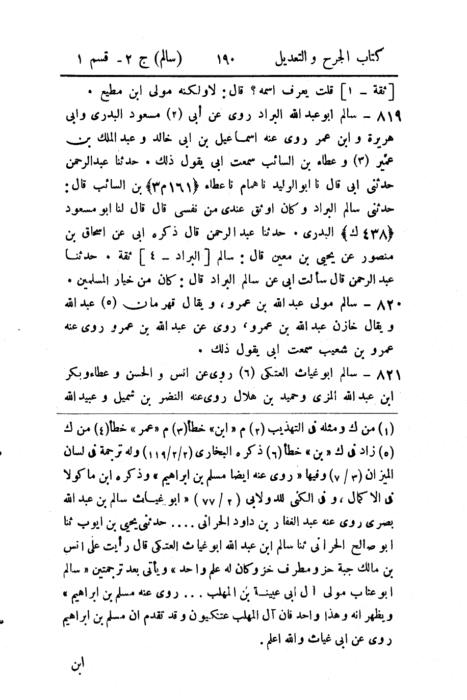 819 - سالم أبو عبد الله البراد روى عن أبي (2) مسعود البدري وأبي هريرة وابن عمر روى عنه إسماعيل بن أبي خالد وعبد الملك بن عمير (3) وعطاء بن السائب سمعت أبي يقول ذلك.