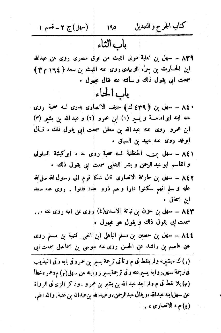839 - سهل بن ثعلبة مولى الليث من فوق مصري روى عن عبد الله ابن الحارث بن جزء الزبيدي روى عنه الليث بن سعد (164 م 3) سمعت أبي يقول ذلك وسألته عنه فقال مجهول.