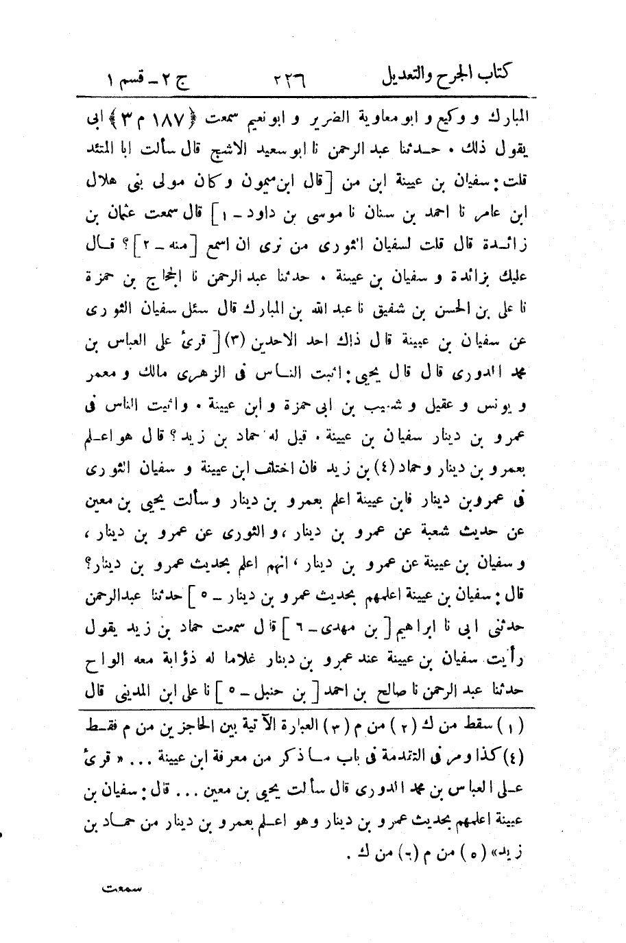 (1) سقط من ك (2) من م (3) العبارة الآتية بين الحاجزين من م فقط (4) كذا ومر في التقدمة في باب ما ذكر من معرفة ابن عيينة ... " قرئ على العباس بن محمد الدوري قال سألت يحيى بن معين ... قال: سفيان بن عيينة أعلمهم بحديث عمرو بن دينار وهو أعلم بعمرو بن دينار من حماد بن