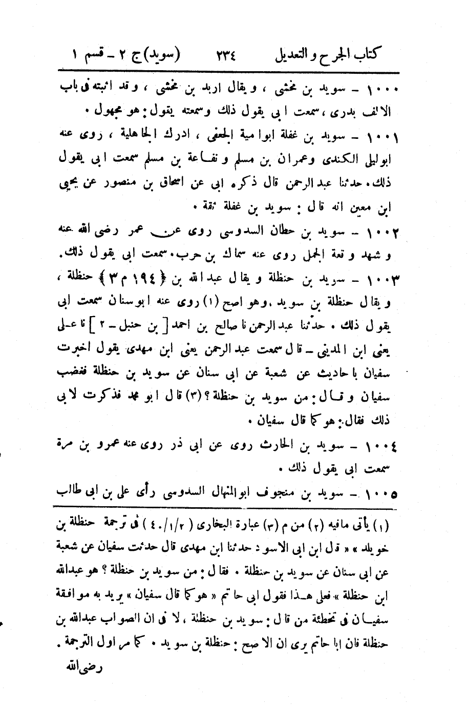 ابن حنظلة " فعلى هذا فقول ابى حاتم " هو كما قال سفيان " يريد به موافقة سفيان في تخطئة من قال: سويد بن حنظلة، لا في ان الصواب عبد الله بن حنظلة فان ابا حاتم يرى ان الاصح: حنظلة بن سويد.