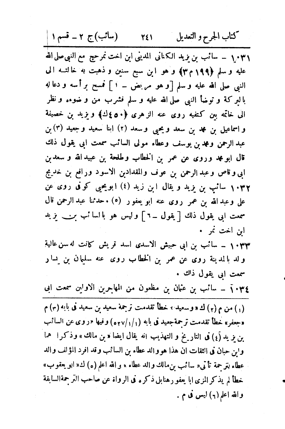 1033 - سائب بن أبي حبيش الأسدي أسد قريش كانت له سن عالية ولد بالمدينة روى عن عمر بن الخطاب روى عنه سليمان بن يسار سمعت أبي يقول ذلك.