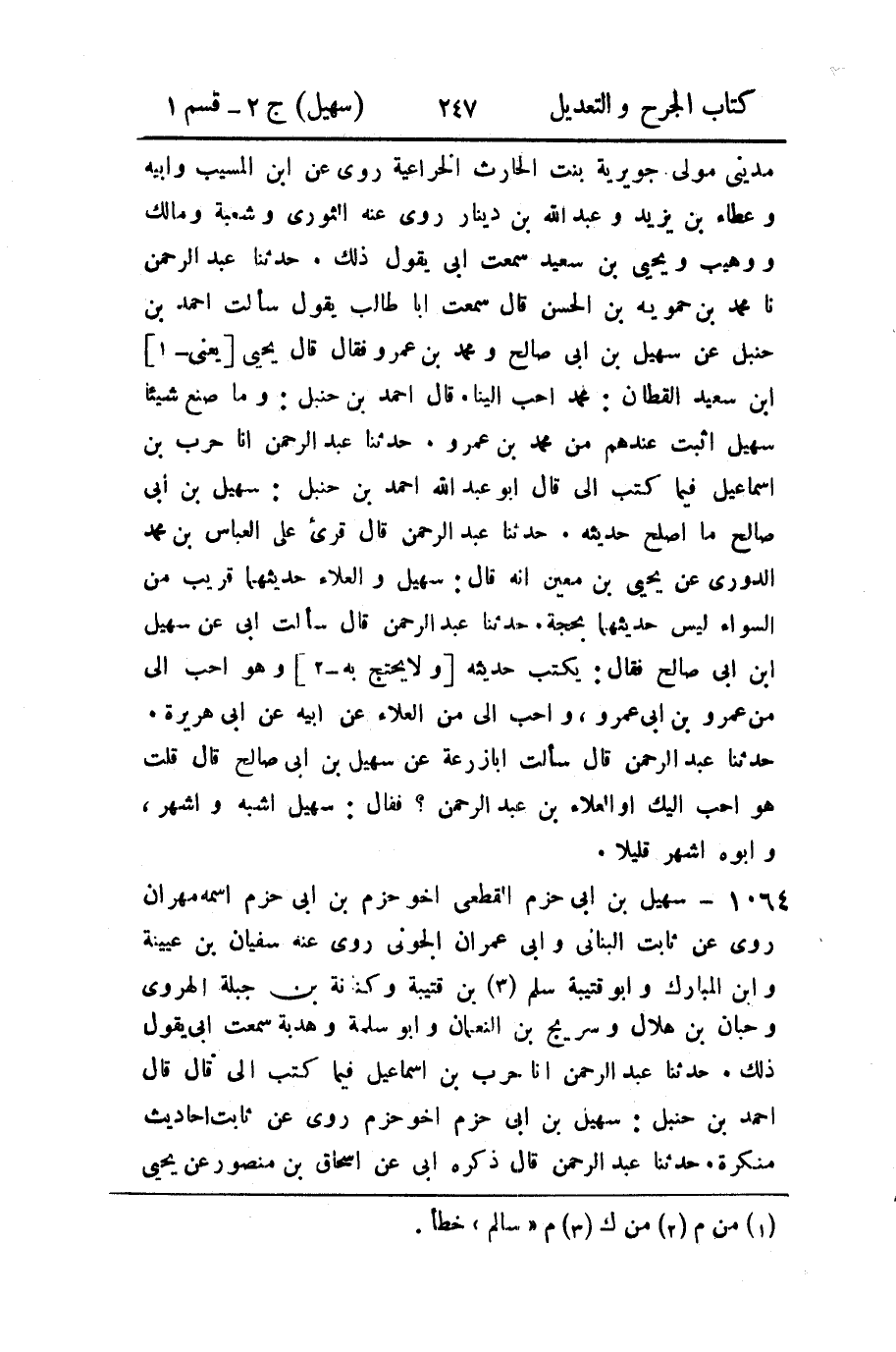 1064 - سهيل بن أبي حزم القطعي أخو حزم بن أبي حزم اسمه مهران روى عن ثابت البناني وأبي عمران الجوني روى عنه سفيان بن عيينة وابن المبارك وأبو قتيبة سلم (3) بن قتيبة وكنانة بن جبلة الهروي وحبان بن هلال وسريج بن النعمان وأبو سلمة وهدبة سمعت أبي يقول ذلك.
