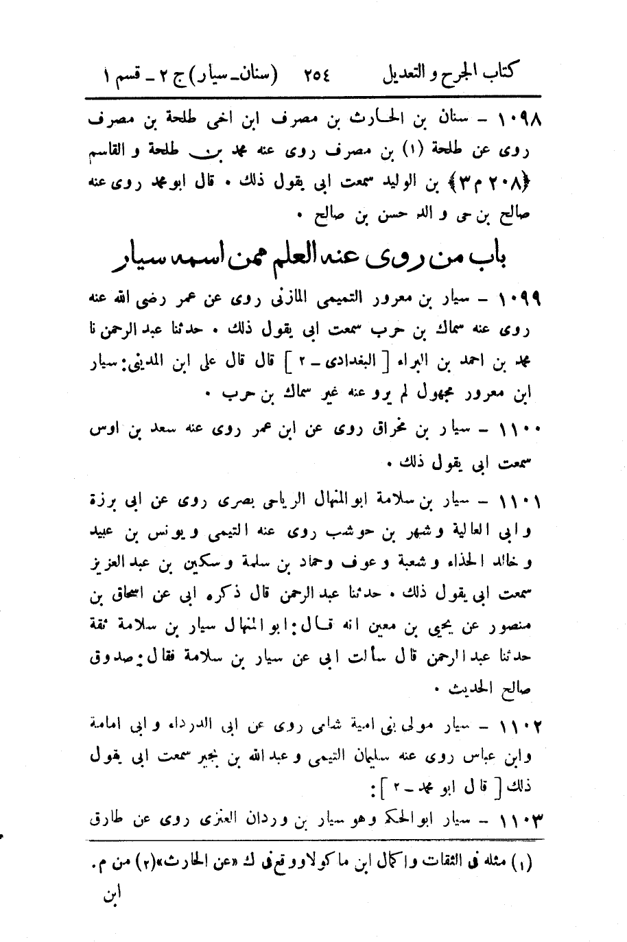 1098 - سنان بن الحارث بن مصرف ابن أخي طلحة بن مصرف روى عن طلحة (1) بن مصرف روى عنه محمد بن طلحة والقاسم (208 م 3) بن الوليد سمعت أبي يقول ذلك.