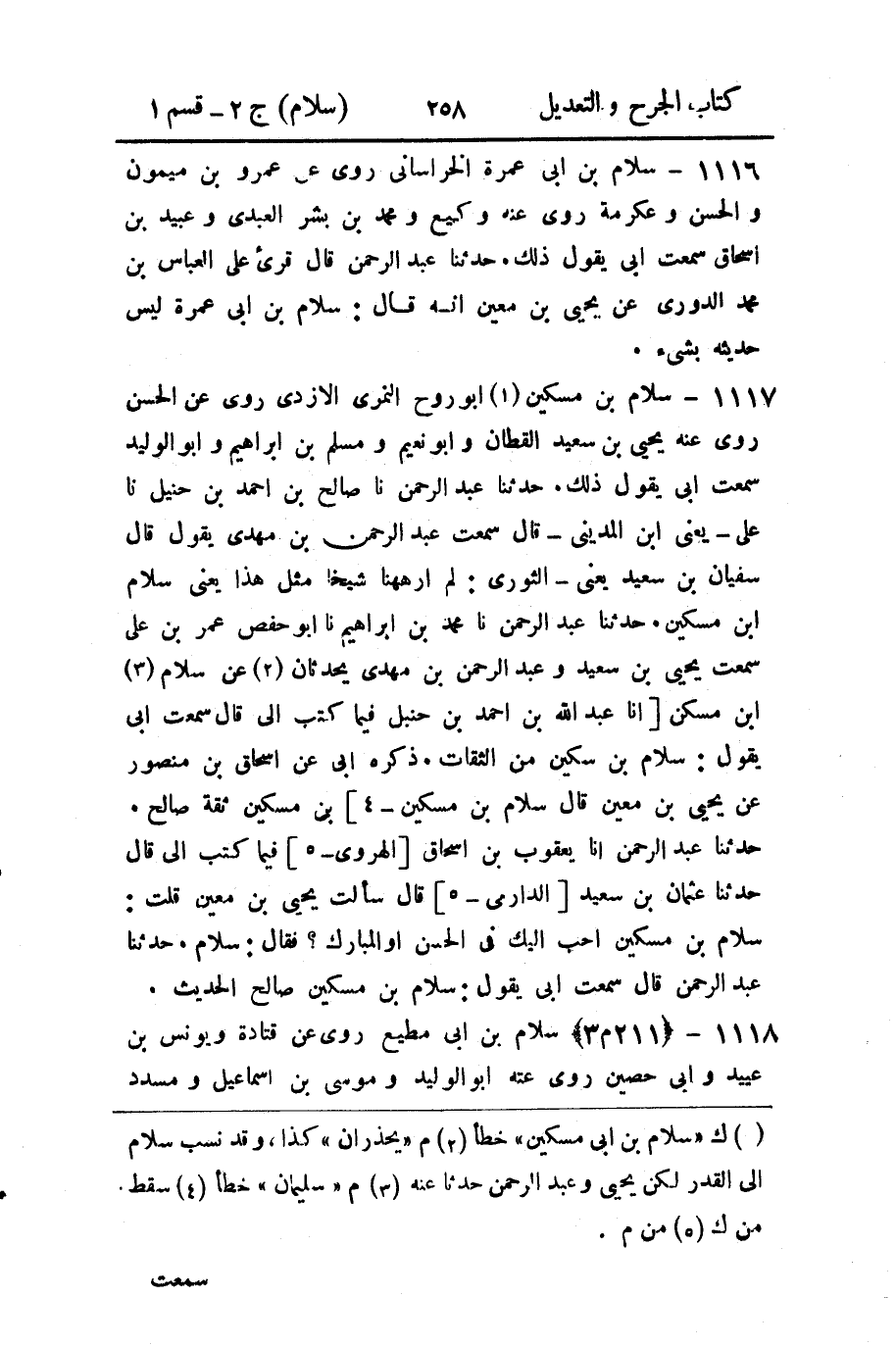 حدثنا عبد الرحمن نا محمد بن إبراهيم نا أبو حفص عمر بن علي سمعت يحيى بن سعيد وعبد الرحمن بن مهدي يحدثان (2) عن سلام (3) ابن مسكن [أنا عبد الله بن أحمد بن حنبل فيما كتب إلي قال سمعت أبي يقول: سلام بن سكين من الثقات.