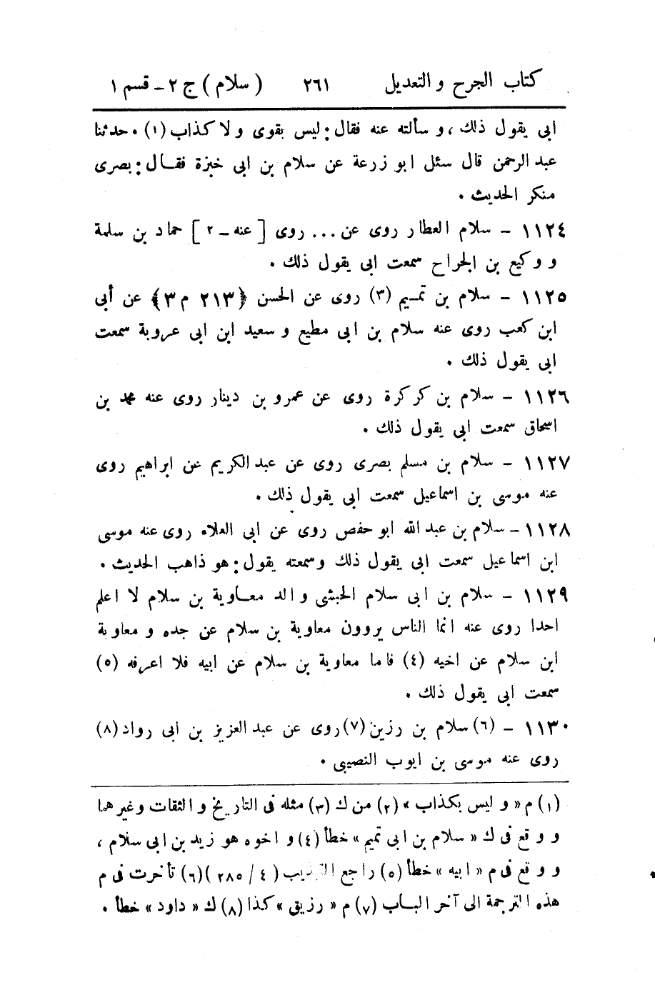 1129 - سلام بن أبي سلام الحبشي والد معاوية بن سلام لا أعلم أحدا روى عنه إنما الناس يروون معاوية بن سلام عن جده ومعاوية ابن سلام عن أخيه (4) فأما معاوية بن سلام عن أبيه فلا أعرفه (5) سمعت أبي يقول ذلك.