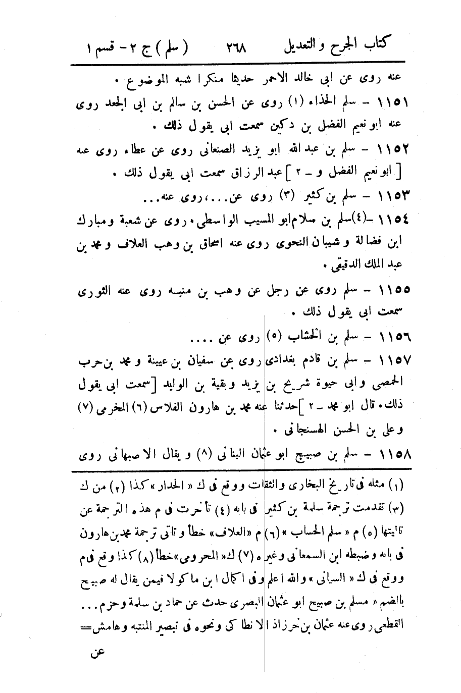 1156 - سلم بن الخشاب (5) روى عن ... 1157 - سلم بن قادم بغدادي روى عن سفيان بن عيينة ومحمد بن حرب الحمصي وأبي حيوة شريح بن يزيد وبقية بن الوليد [سمعت أبي يقول