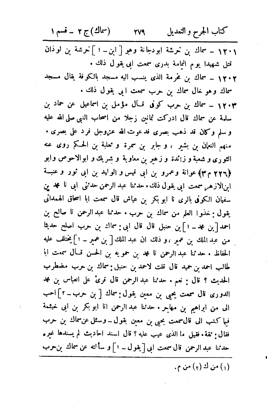 1203 - سماك بن حرب كوفي قال مؤمل بن إسماعيل عن حماد بن سلمة عن سماك قال أدركت ثمانين رجلا من أصحاب النبي صلى الله عليه وسلم وكان قد ذهب بصري فدعوت الله عزوجل فرد عليَّ بصري.