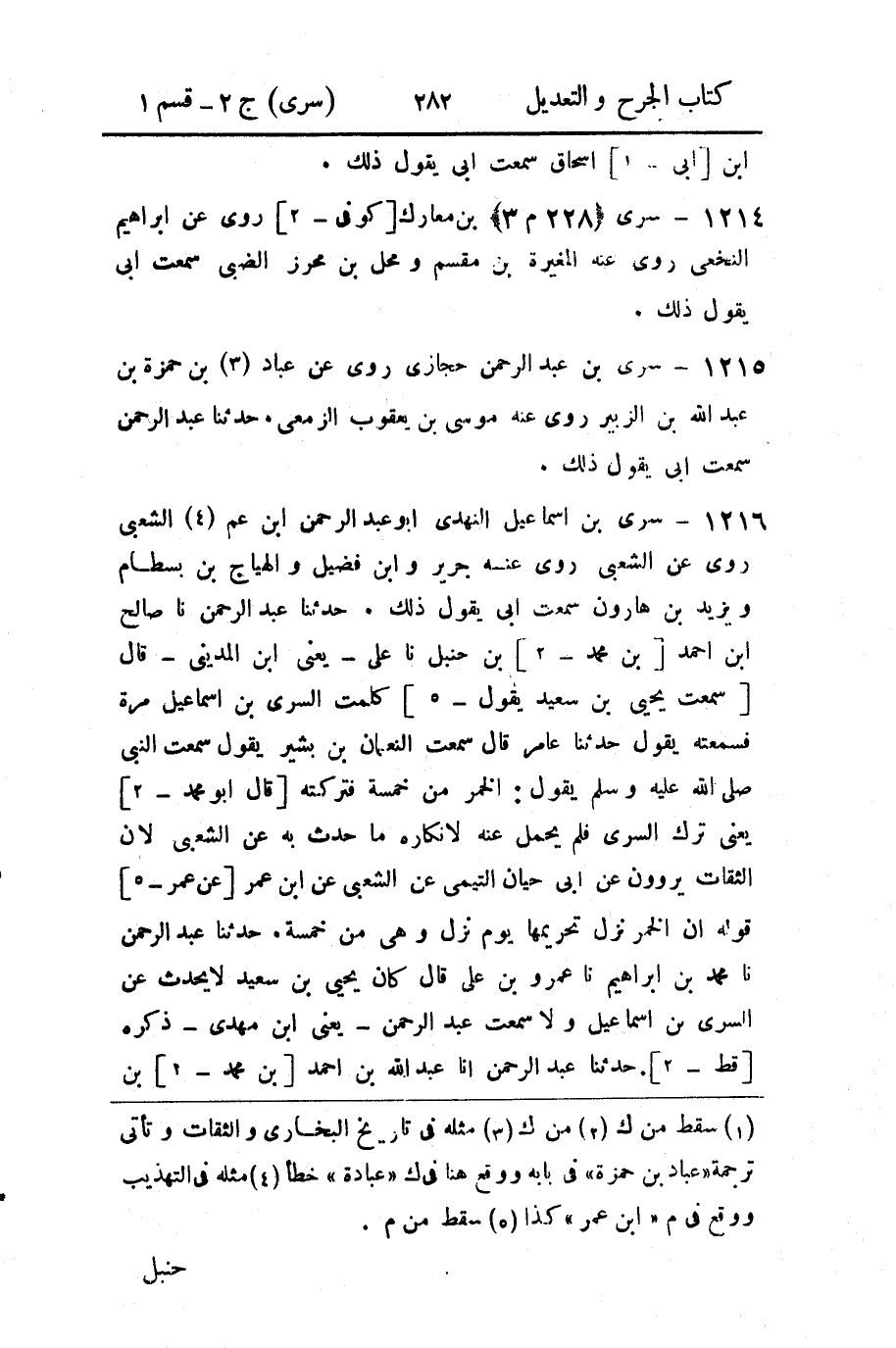 حدثنا عبد الرحمن نا صالح ابن أحمد [بن محمد - 2] بن حنبل نا علي - يعني ابن المديني - قال [سمعت يحيى بن سعيد يَقُولُ - 5] كَلَّمْتُ السَّرِيَّ بْنَ إِسْمَاعِيلَ مَرَّةً فَسَمِعْتُهُ يَقُولُ حدثنا عَامِرٌ قَالَ سَمِعْتُ النُّعْمَانَ بْنَ بَشِيرٍ يقول سمعت النبي صلى الله عَلَيْهِ وَسَلَّمَ يَقُولُ: الْخَمْرُ مِنْ خَمْسَةٍ فَتَرَكْتُهُ [قَالَ أَبُو مُحَمَّدٍ - 2] يَعْنِي تَرَكَ السَّرِيَّ فَلَمْ يَحْمِلْ عَنْهُ لإِنْكَارِهِ مَا حَدَّثَ بِهِ عَنِ الشَّعْبِيِّ لأَنَّ الثِّقَاتِ يَرْوُونَ عَنْ أَبِي حَيَّانَ التَّيْمِيِّ عَنِ الشَّعْبِيِّ عَنِ ابْنِ عُمَرَ [عَنْ عُمَرَ - 5] قَوْلَهُ أَنَّ الْخَمْرَ نَزَلَ تَحْرِيمُهَا يَوْمَ نَزَلَ وَهِيَ مِنْ خَمْسَةٍ.