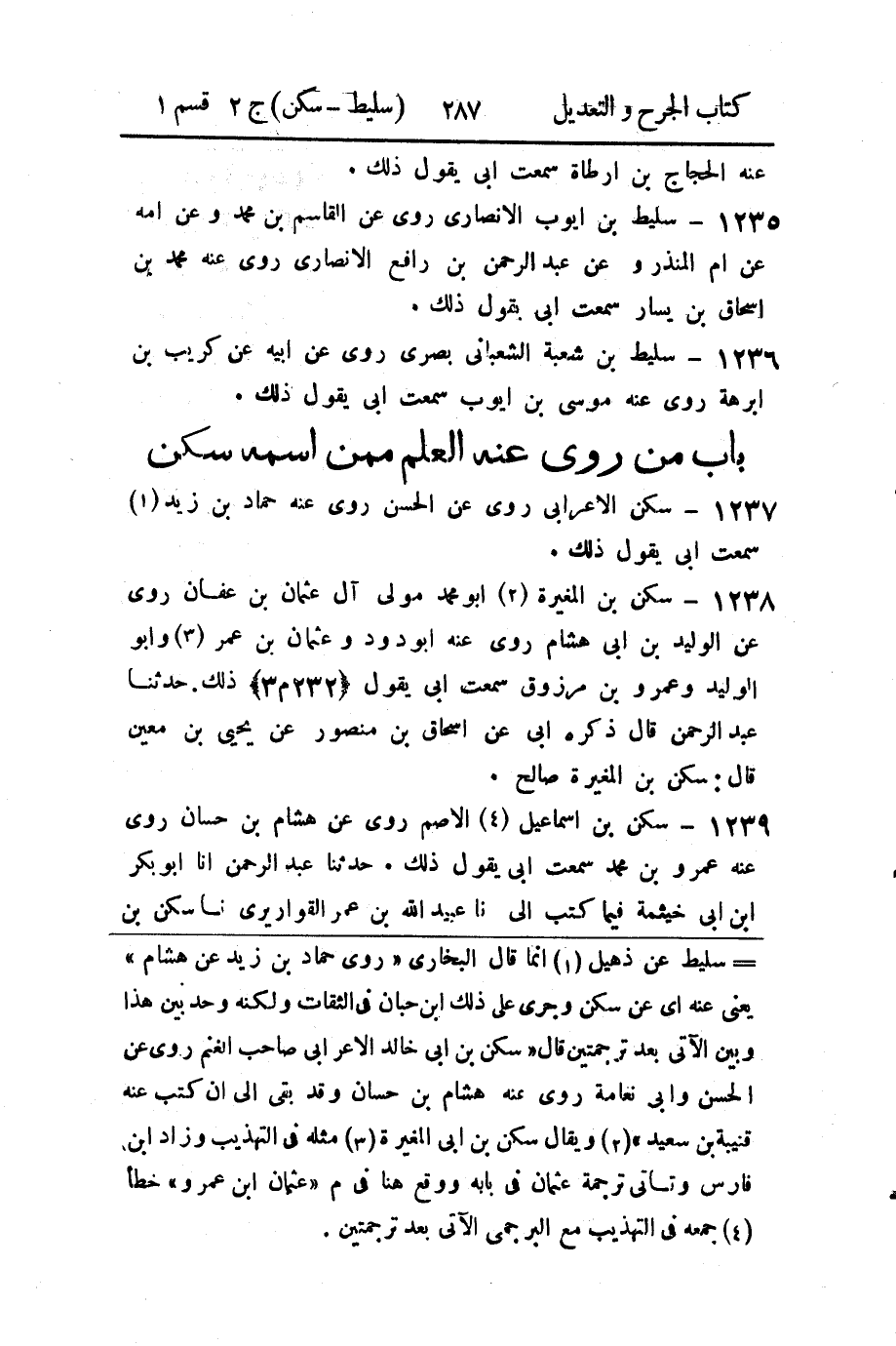1238 - سكن بن المغيرة (2) أبو محمد مولى آل عثمان بن عفان روى عن الوليد بن أبي هشام روى عنه أبو دود وعثمان بن عمر (3) وأبو الوليد وعمرو بن مرزوق سمعت أبي يقول (232 م 3) ذلك.
