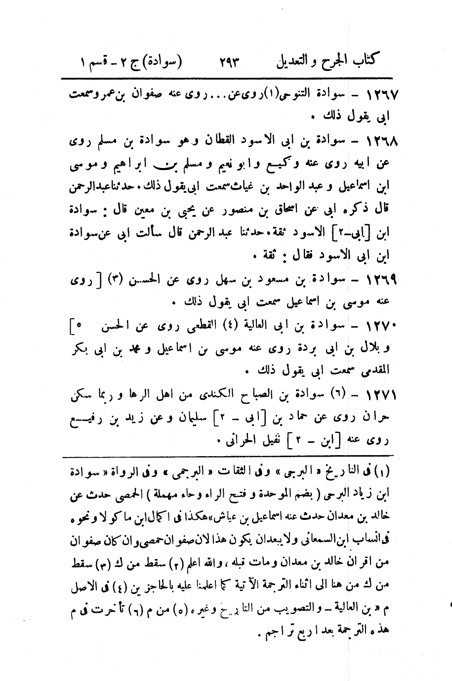 (1) في التاريخ " البرجى " وفى الثقات " البرجمى " وفى الرواة " سوادة ابن زياد البرحى (بضم الموحدة وفتح الراء وحاء مهملة) الحمصى حدث عن خالد بن معدان حدث عنه اسماعيل بن عياش " هكذا في اكمال ابن ماكولا ونحوه في انساب ابن السمعاني ولا يبعد ان يكون هذا لان صفوان حمصي وان كان صفوان من اقران خالد بن معدان ومات قبله، والله اعلم (2) سقط من ك (3) سقط من ك من هنا إلى اثناء الترجمة الآتية كما اعلمنا عليه بالحاجزين (4) في الاصل م " بن العالية - والتصويب من التاريخ وغيره (5) من م (6) تأخرت في م هذه الترجمة بعد اربع تراجم.