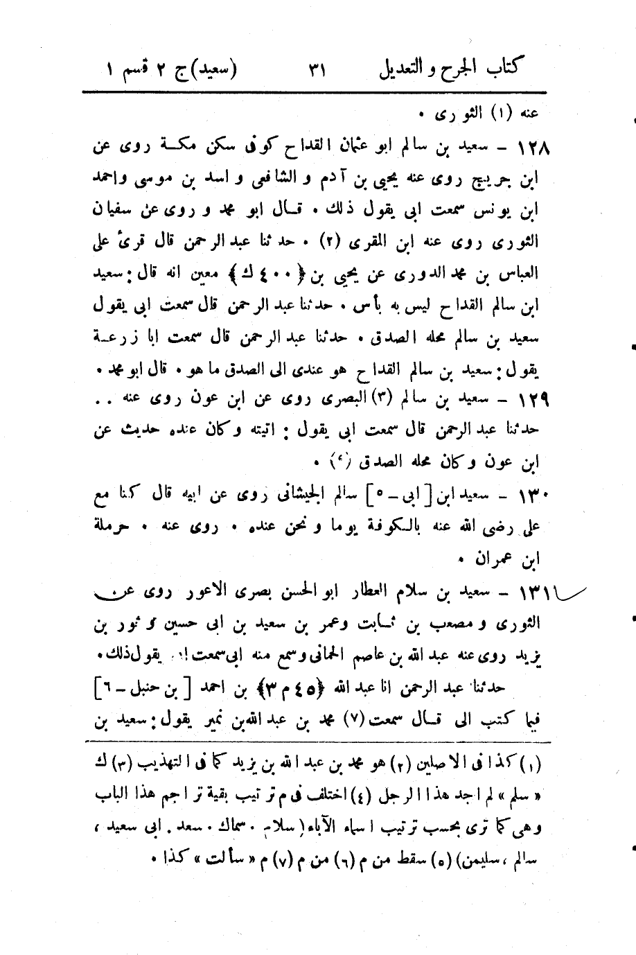 129 - سعيد بن سالم (3) البصري روى عن ابن عون روى عنه..حدثنا عبد الرحمن قال سمعت أبي يقول: أتيته وكان عنده حديث عن ابن عون وكان محله الصدق (4) .