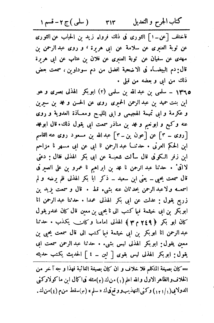 1365 - سلمى بن عبد الله بن سلمى (1) أبو بكر الهذلي بصري وهو ابن بنت حميد بن عبد الرحمن الحميري روى عن الحسن ومحمد بن سيرين وعكرمة وأبي تميمة الهجيمي وأبي المليح ومعاذة العدوية وروى عنه وكيع وأبو نعيم ومحمد بن مناذر سمعت أبي يقول ذلك.