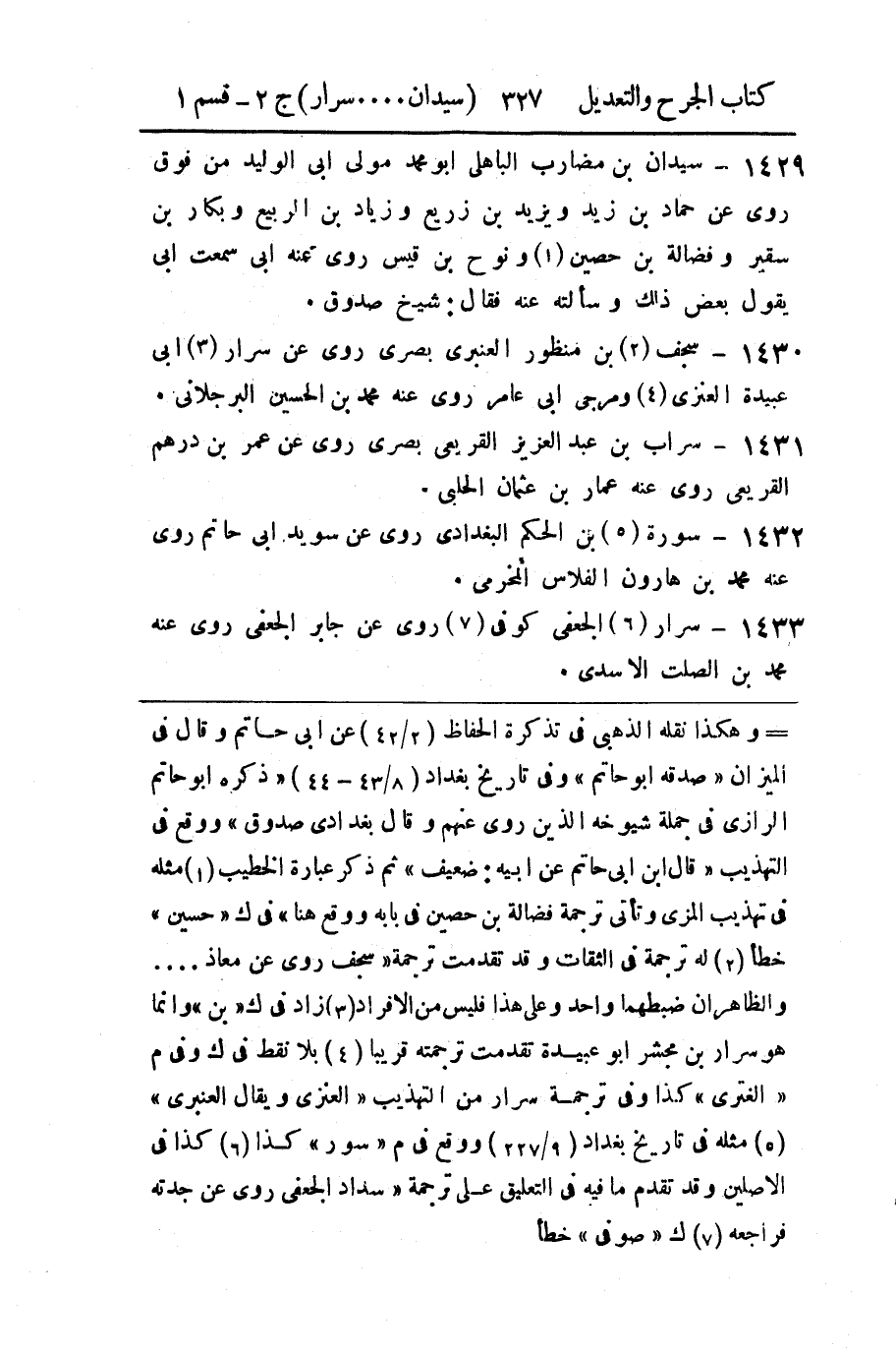 1430 - سجف (2) بن منظور العنبري بصري روى عن سرار (3) أبي عبيدة العنزي (4) ومرجى أبي عامر روى عنه محمد بن الحسين البرجلاني.