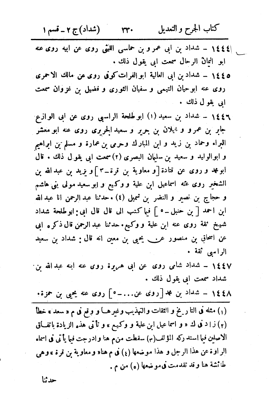 1446 - شداد بن سعيد (1) أبو طلحة الراسبي روى عن أبي الوازع جابر بن عمرو وغيلان بن جرير وسعيد الجريري روى عنه أبو معشر البراء وحماد بن زيد وابن المبارك وحرمي بن عمارة ومسلم بن إبراهيم وأبو الوليد وسعيد بن سليمان البصري (2) سمعت أبي يقول ذلك.
