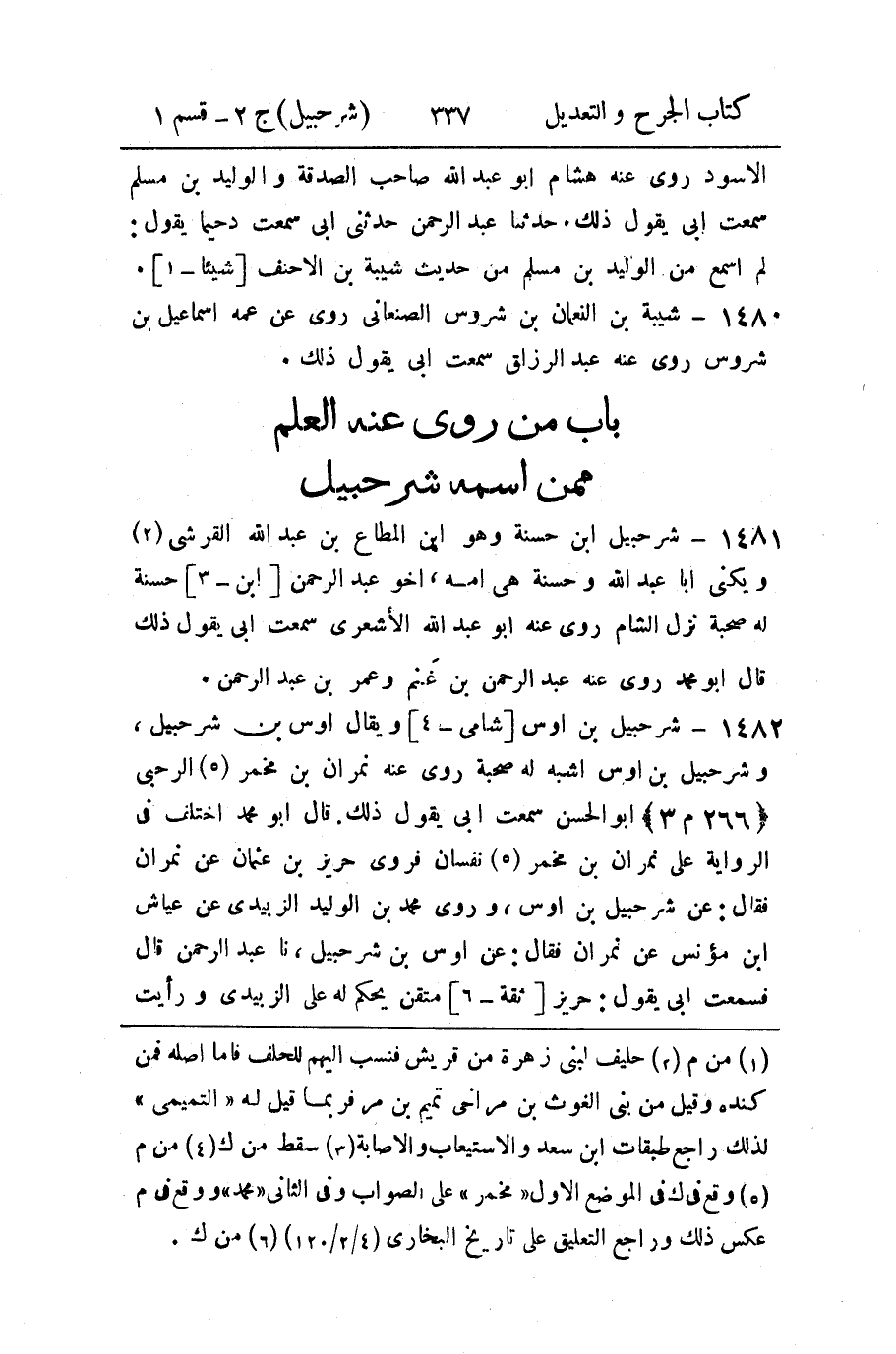 1481 - شرحبيل ابن حسنة وهو ابن المطاع بن عبد الله القرشي (2) ويكنى أبا عبد الله وحسنة هي أمه، اخو عبد الرحمن [ابن - 3] حسنة له صحبة نزل الشام روى عنه أبو عبد الله الأشعري سمعت أبي يقول ذلك قال أبو محمد روى عنه عبد الرحمن بن غنم وعمر بن عبد الرحمن.