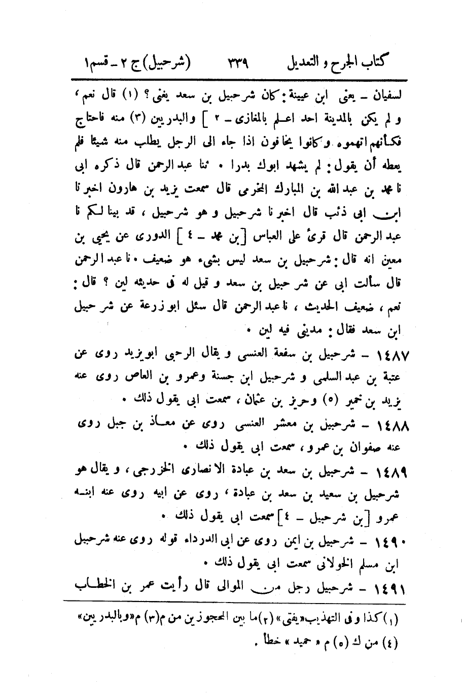 1489 - شرحبيل بن سعد عبادة الأنصاري الخزرجي، ويقال هو شرحبيل بن سعيد بن سعد بن عبادة، روى عن أبيه روى عنه ابنه عمرو [بن شرحبيل - 4] سمعت أبي يقول ذلك.