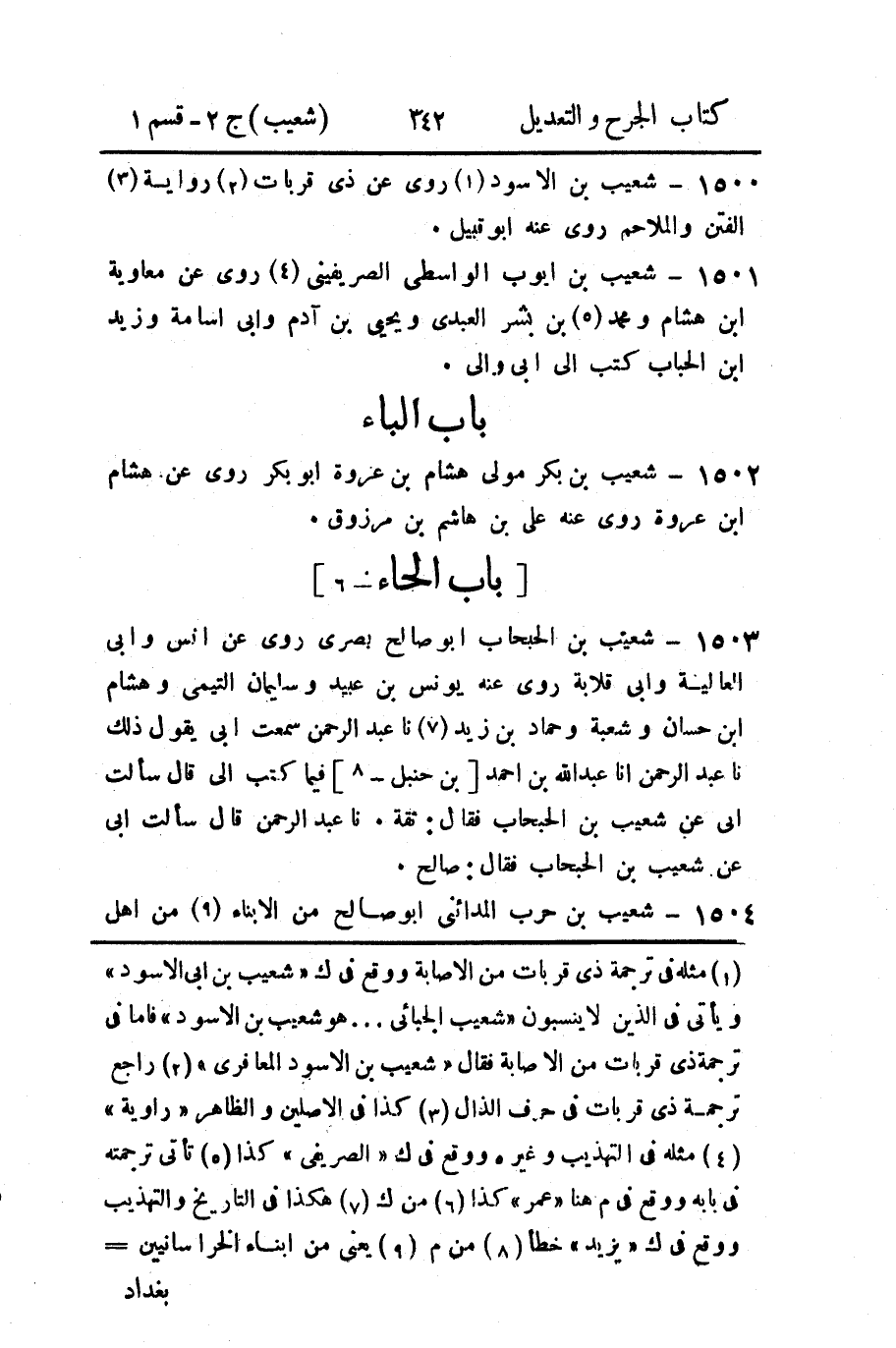 - 6] 1503 - شعيب بن الحبحاب أبو صالح بصري روى عن أنس وأبي العالية وأبي قلابة روى عنه يونس بن عبيد وسليمان التيمي وهشام ابن حسان وشعبة وحماد بن زيد (7) نا عبد الرحمن سمعت أبي يقول ذلك نا عبد الرحمن أنا عبد الله بن أحمد [بن حنبل - 8] فيما كتب إلي قال سألت أبي عن شعيب بن الحبحاب فقال: ثقة.