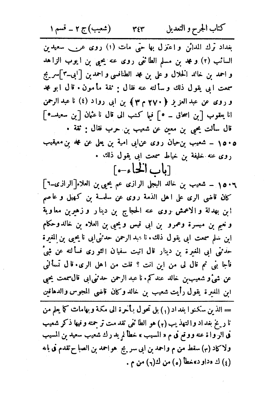- 5] 1506 - شعيب بن خالد البجلي الرازي عم يحيى بن العلاء [الرازي - 6] كان قاضي الري على أهل الذمة روى عن سلمة بن كهيل وعاصم ابن بهدلة والأعمش روى عنه الحجاج بن دينار وزهير بن معاوية ونعيم بن ميسرة وعمرو بن أبي قيس ويحيى بن العلاء بن خالد وحكام ابن سلم سمعت أبي يقول ذلك.