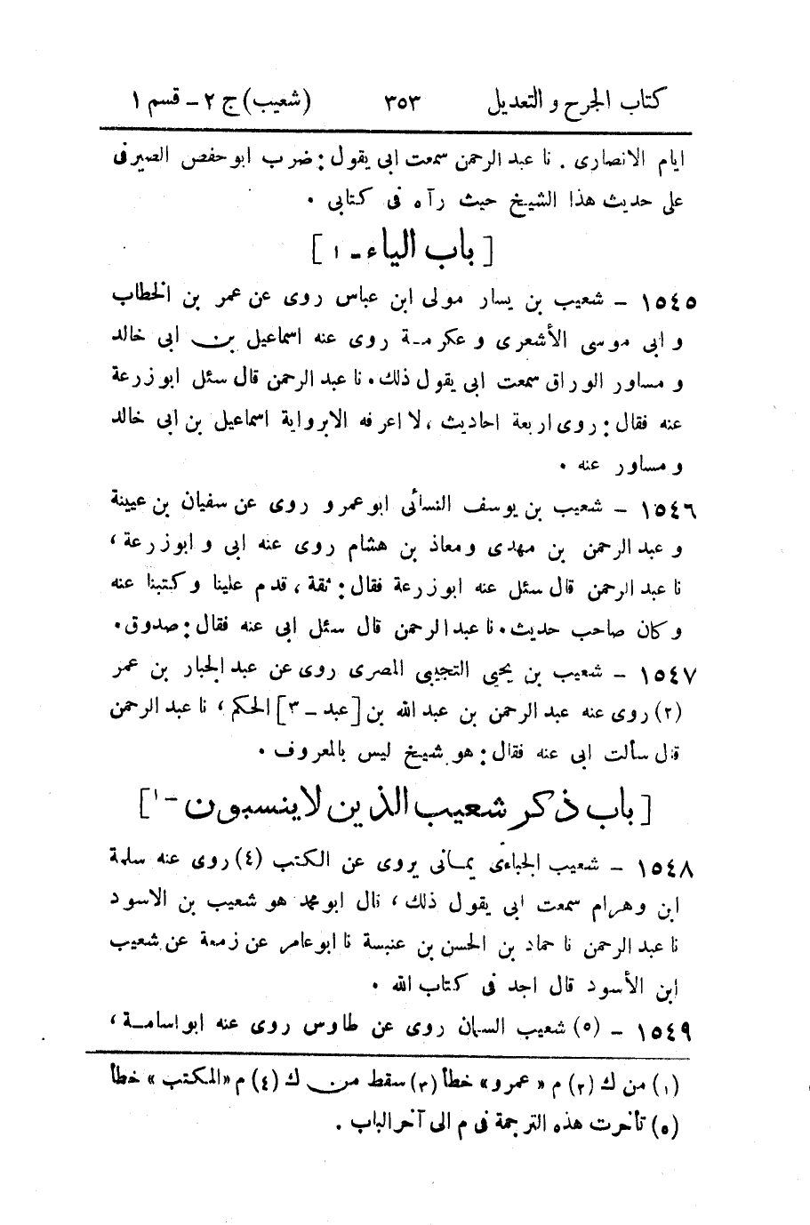 - 1] 1545 - شعيب بن يسار مولى ابن عباس روى عن عمر بن الخطاب وأبي موسى الأشعري وعكرمة روى عنه إسماعيل بن أبي خالد ومساور الوراق سمعت أبي يقول ذلك.