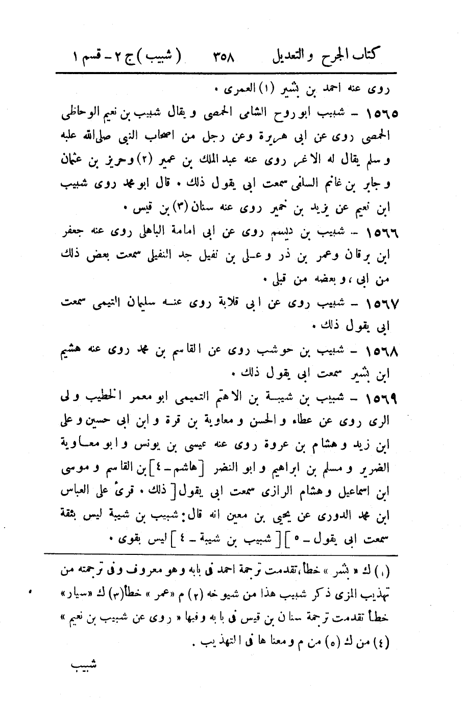 (1) ك " بشر " خطأ، تقدمت ترجمة احمد في بابه وهو معروف وفى ترجمته من تهذيب المزى ذكر شبيب هذا من شيوخه (2) م " عمر " خطأ (3) ك " سيار " خطأ تقدمت ترجمة سنان بن قيس في بابه وفيها " روى عن شبيب بن نعيم " (4) من ك (5) من م ومعناها في التهذيب.