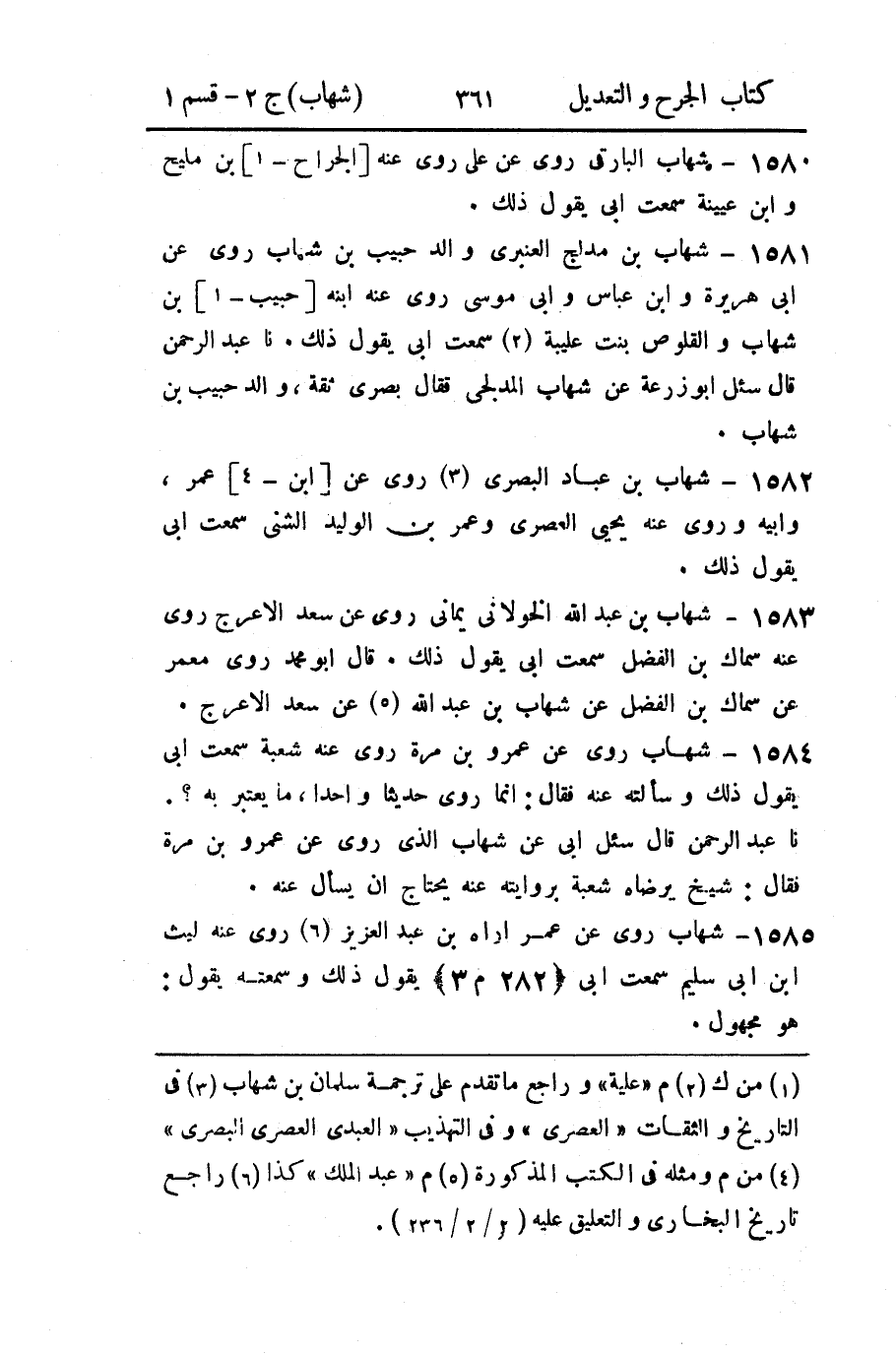 1585 - شهاب روى عن عمر اراه بن عبد العزيز (6) روى عنه ليث ابن أبي سليم سمعت أبي (282 م 3) يقول ذلك وسمعته يقول: هو مجهول.