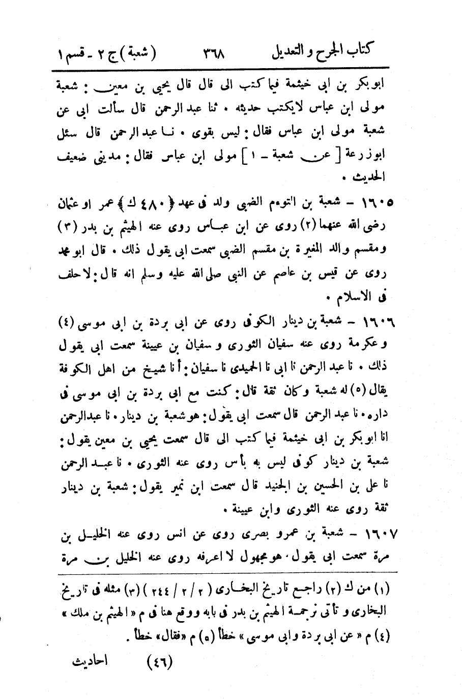 1605 - شعبة بن التوءم الضبي ولد في عهد (480 ك) عمر أو عثمان رضي الله عنهما (2) روى عن ابن عباس روى عنه الهيثم بن بدر (3) ومقسم والد المغيرة بن مقسم الضبي سمعت أبي يقول ذلك.