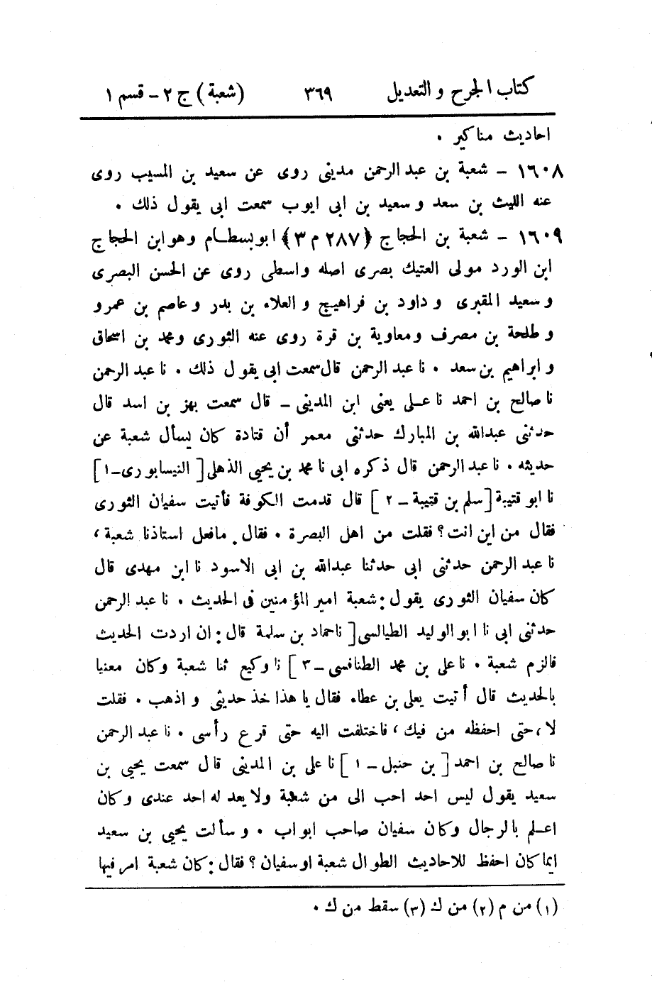 1609 - شعبة بن الحجاج (287 م 3) أبو بسطام وهو ابن الحجاج ابن الورد مولى العتيك بصري أصله واسطي روى عن الحسن البصري وسعيد المقبري وداود بن فراهيج والعلاء بن بدر وعاصم بن عمرو وطلحة بن مصرف ومعاوية بن قرة روى عنه الثوري ومحمد بن إسحاق وإبراهيم بن سعد.