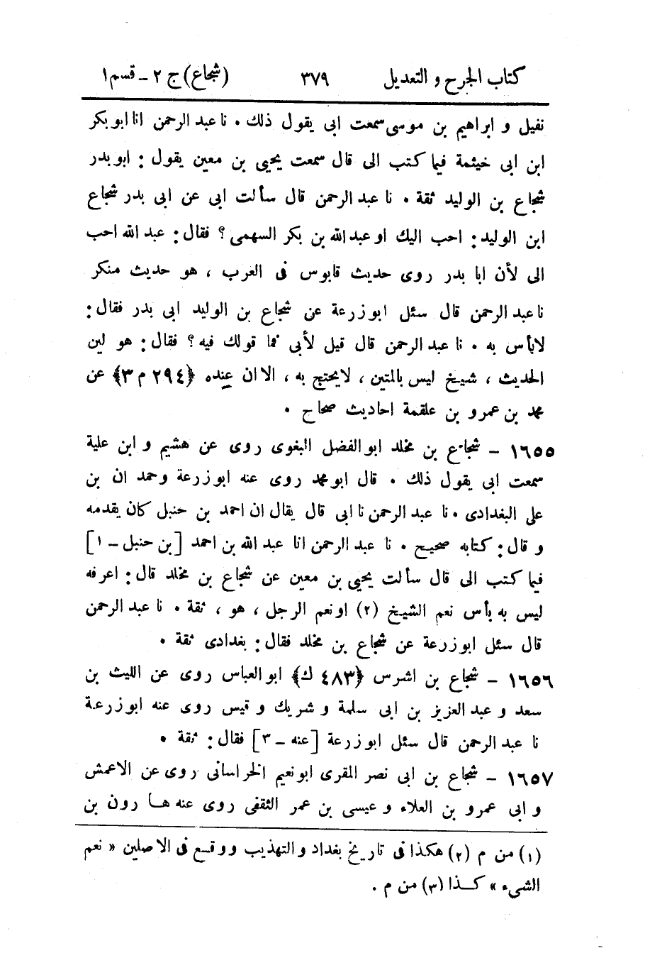 نا عبد الرحمن قال سألت أبي عن ابى بدر شجاع ابن الوليد: أحب إليك أو عبد الله بن بكر السهمي؟ فقال: عبد الله أحب إلي لأن أبا بدر روى حديث قابوس في العرب.