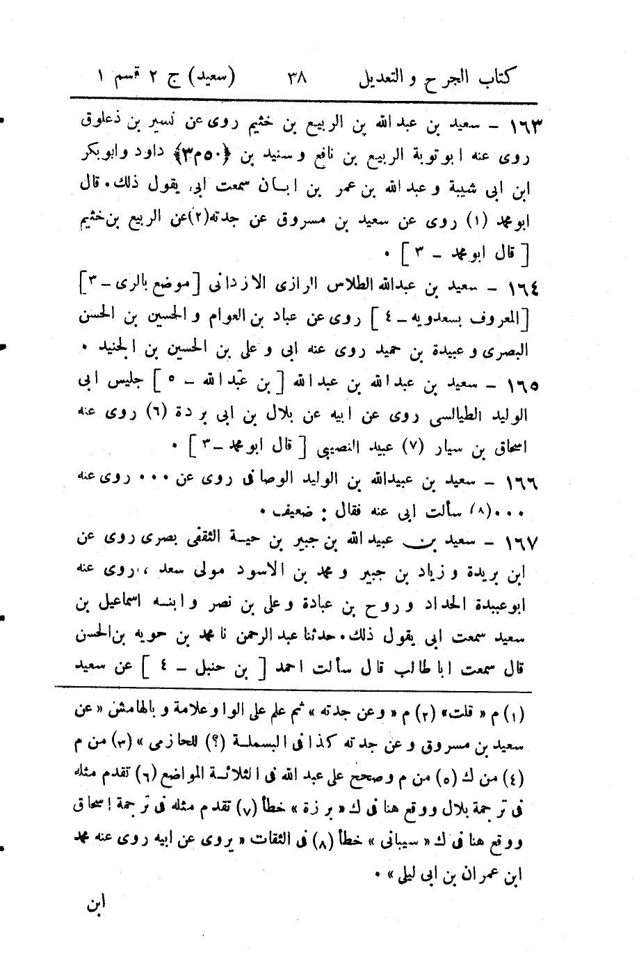 165 - سعيد بن عبد الله بن عَبْدِ اللَّهِ [بْنِ عَبْدِ اللَّهِ - 5] جليس أبي الوليد الطيالسي روى عن أبيه عن بلال بن أبي بردة (6) روى عنه إسحاق بن سيار (7) عبيد النصيبي [قال أبو محمد - 3] .