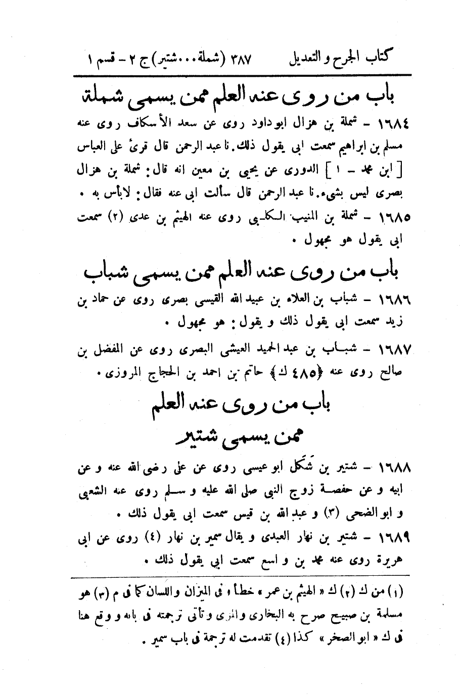 1688 - شتير بن شكل أبو عيسى روى عن علي رضي الله عنه وعن أبيه وعن حفصة زوج النبي صلى الله عليه وسلم روى عنه الشعبي وأبو الضحى (3) وعبد الله بن قيس سمعت أبي يقول ذلك.