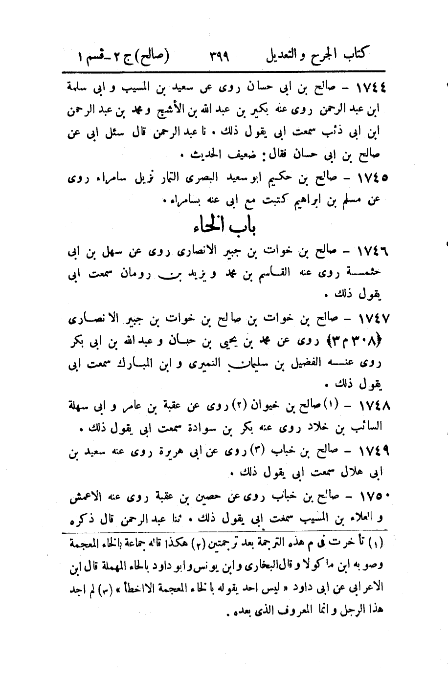 (1) تأخرت في م هذه الترجمة بعد ترجمتين (2) هكذا قاله جماعة بالخاء المعجمة وصوبه ابن ماكولا وقال البخاري وابن يونس وابو داود بالحاء المهملة قال ابن الاعرابي عن ابى داود " ليس احد يقوله بالخاء المعجمة الا اخطأ " (3) لم اجد هذا الرجل وانما المعروف الذى بعده.