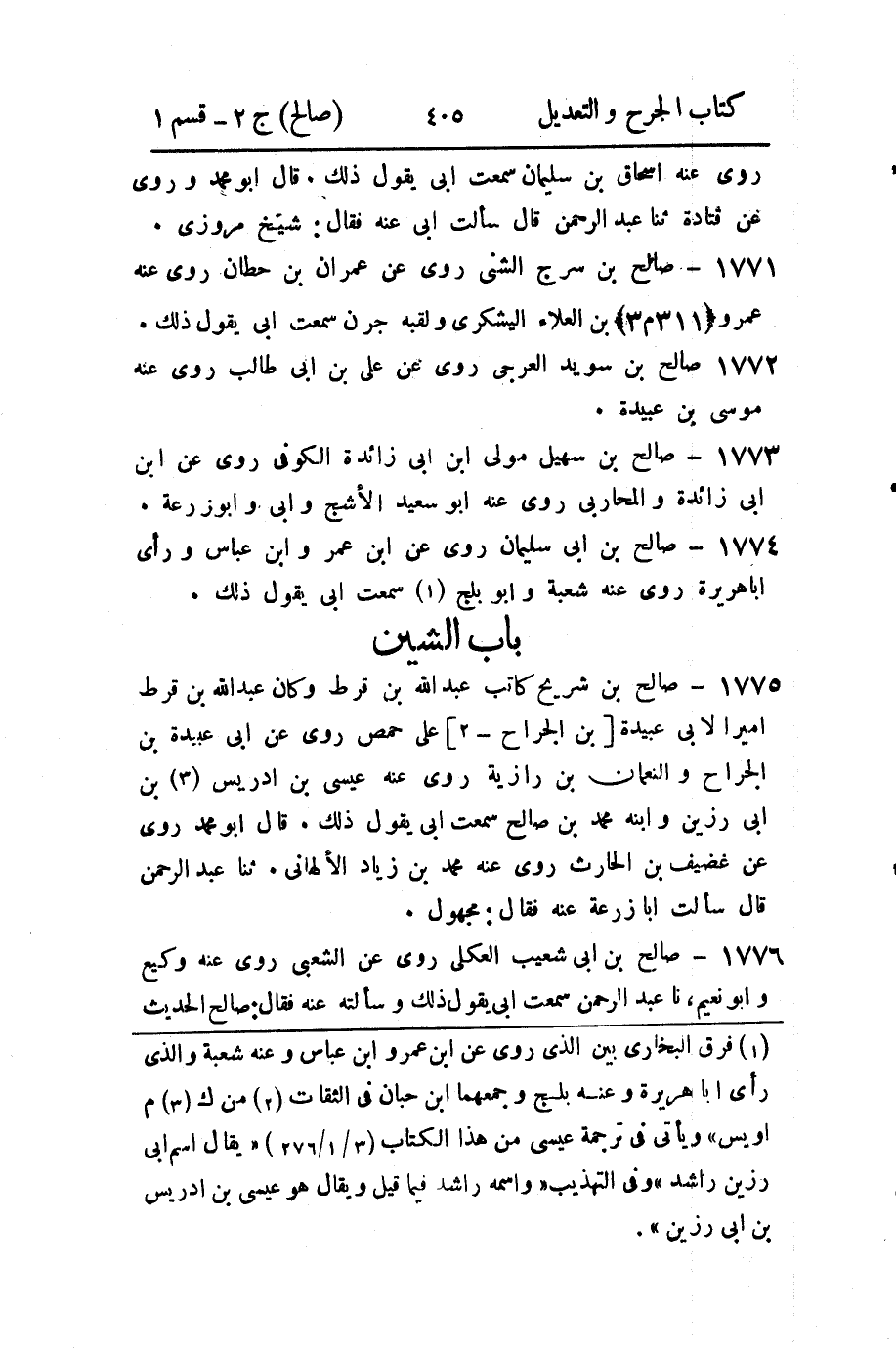 1775 - صالح بن شريح كاتب عبد الله بن قرط وكان عبد الله بن قرط أميرا لأبي عبيدة [بن الجراح - 2] على حمص روى عن أبي عبيدة بن الجراح والنعمان بن رازية روى عنه عيسى بن إدريس (3) بن أبي رزين وابنه محمد بن صالح سمعت أبي يقول ذلك.