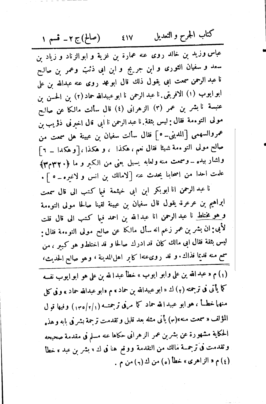 (1) م " عبد الله بن على وابو ايوب " خطأ عبد الله بن على هو أبو ايوب نفسه كما يأتي في ترجمته (2) ك " أبو عبيد الله بن حماد " م " أبو عبد الله حماد " وفى كل منهما خطأ، هو أبو عبيد الله حماد كما مر في ترجمته (1 / 2 / 135) وفيها قول المؤلف " سمعت منه " (3) يأتي مثله بعد قليل وتقدمت ترجمة بشر في بابه وهذه الحكاية مشهورة عن بشر بن عمر الزهراني حكاها عنه مسلم في مقدمة صحيحه وتقدمت في ترجمة مالك من التقدمة ووقع هنا في ك " بشر بن عبد " خطأ (4) م " الزاهرى " خطأ (5) من ك (6) من م.