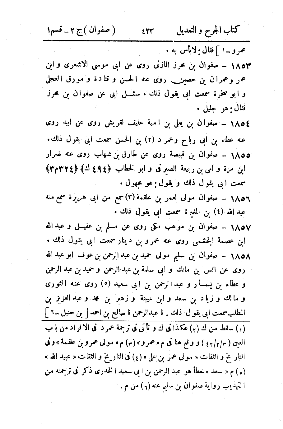 1855 - صفوان بن قبيصة روى عن طارق بن شهاب روى عنه ضرار ابن مرة وأمي بن ربيعة الصيرفي وابو الخطاب (494 ك) (324 م 3) سمعت أبي يقول ذلك ويقول: هو مجهول.