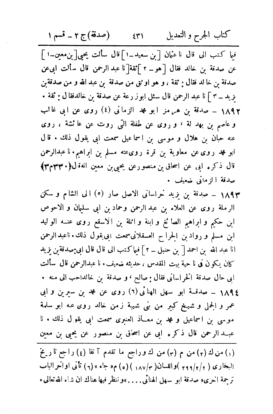 1892 - صدقة بن هرمز أبو محمد الزماني (4) روى عن أبي غالب وعاصم بن بهدلة، وروى عن طفلة التي روت عن عائشة، روى عنه حبان بن هلال وموسى بن إسماعيل سمعت أبي يقول ذلك.