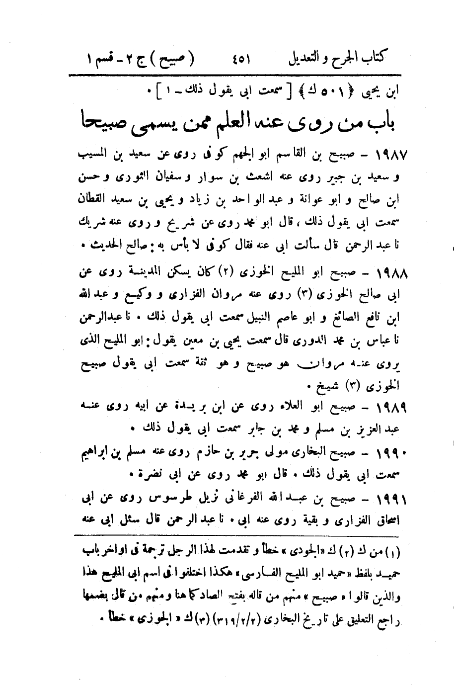1988 - صبيح أبو المليح الخوزي (2) كان يسكن المدينة روى عن أبي صالح الخوزي (3) روى عنه مروان الفزاري ووكيع وعبد الله ابن نافع الصائغ وأبو عاصم النبيل سمعت أبي يقول ذلك.