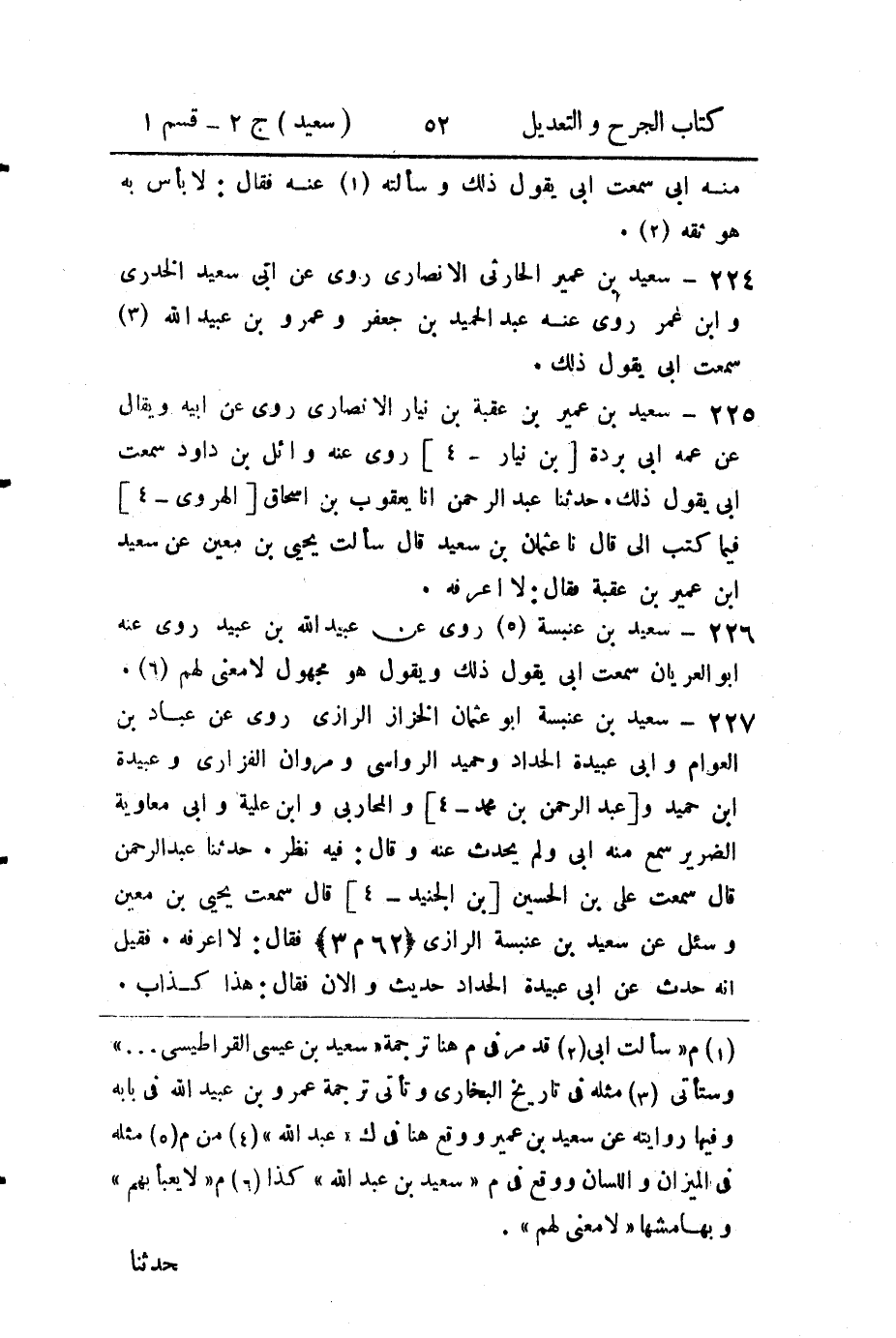 (1) م " سألت ابى (2) قد مر في م هنا ترجمة " سعيد بن عيسى القراطيسى ... " وستأتى (3) مثله في تاريخ البخاري وتأتى ترجمة عمرو بن عبيد الله في بابه وفيها روايته عن سعيد بن عمير ووقع هنا في ك " عبد الله " (4) من م (5) مثله