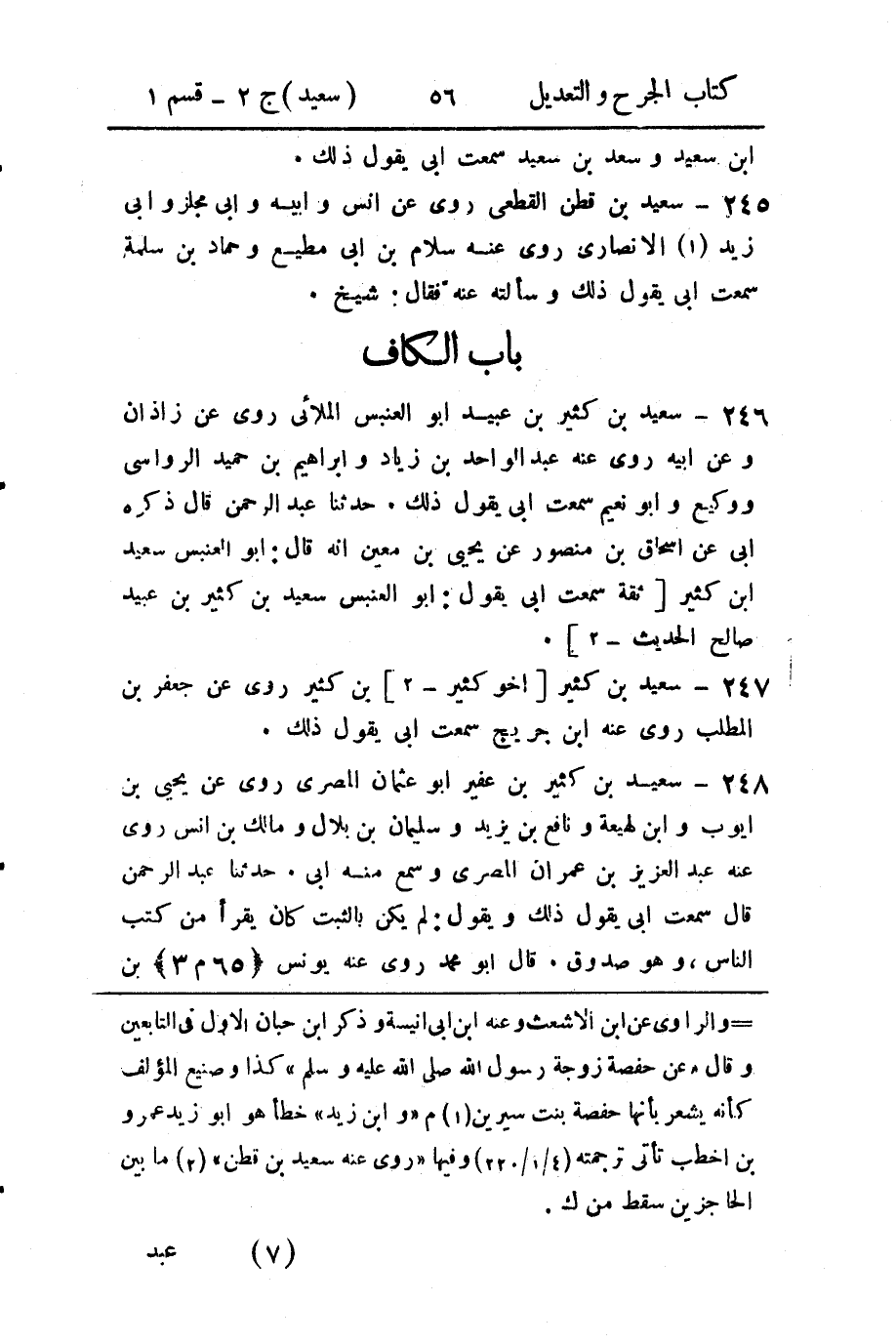 باب الكاف 246 - سعيد بن كثير بن عبيد أبو العنبس الملائي روى عن زاذان وعن أبيه روى عنه عبد الواحد بن زياد وإبراهيم بن حميد الرواسي ووكيع وأبو نعيم سمعت أبي يقول ذلك.