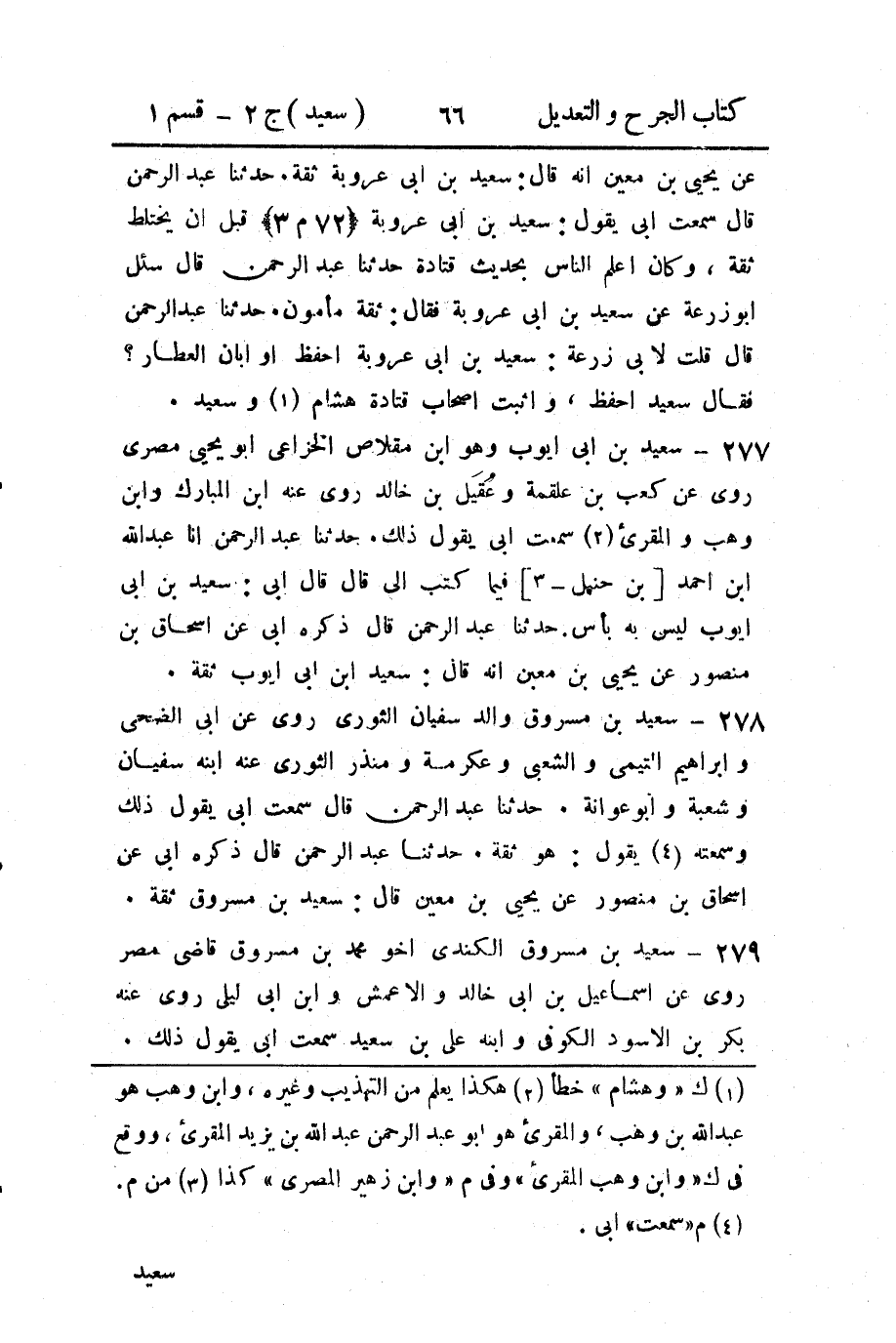 حدثنا عبد الرحمن قال سمعت أبي يقول: سعيد بن ابى عروبة (72 م 3) قبل أن يختلط ثقة، وكان أعلم الناس بحديث قتادة حدثنا عبد الرحمن قال سئل أبو زرعة عن سعيد بن أبي عروبة فقال: ثقة مأمون.